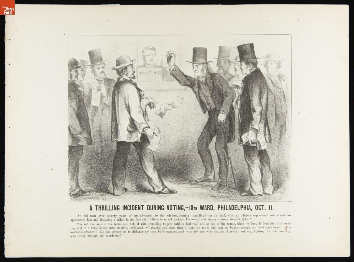 Voting in the 19th century was not a secret process, and intimidation was a common tactic on all sides. Because ballots were preprinted and listed only candidates from a single party, everyone knew who you voted for. This could result in "thrilling" disagreements at polling places, such as this scene from an 1864 election in Philadelphia.