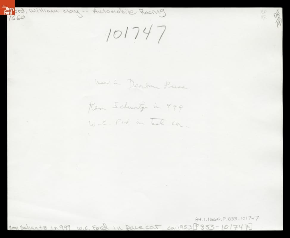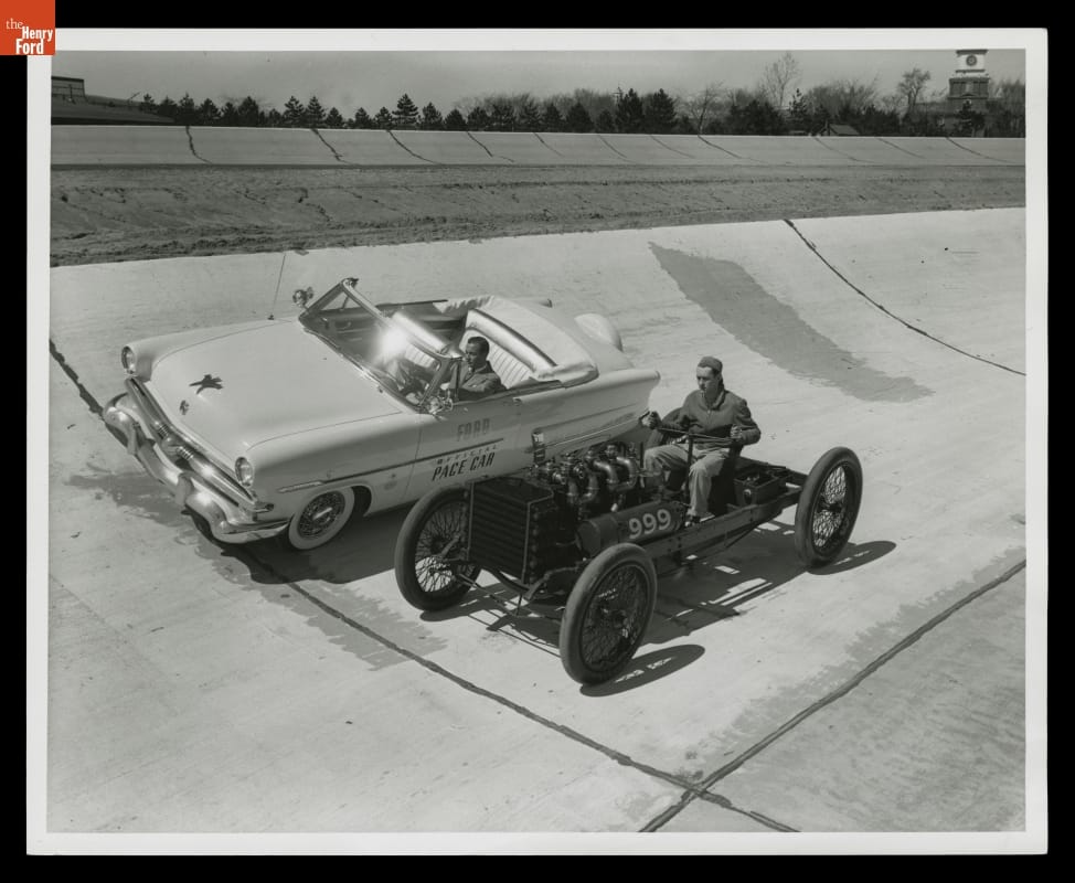 Ford Motor Company celebrated its 50th anniversary in 1953 and was invited to provide the pace car for that year's Indianapolis 500. Six weeks before the race, William Clay Ford and Ken Schuntz posed on the company's Dearborn test track with the pace car -- a 1953 Ford Sunliner -- and the "999" race car built by Henry Ford in 1902.