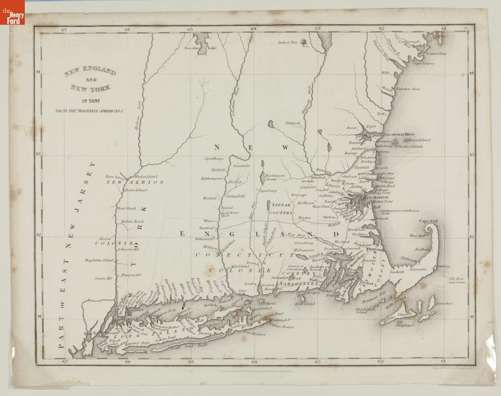 This map, engraved and published in London, England, shows the importance of water routes in the settling of early America. Two crude roads are drawn on the map -- both part of the Boston Post Road, established by the English government in 1673 as a mail-carrying route. This road network later extended to New York State.