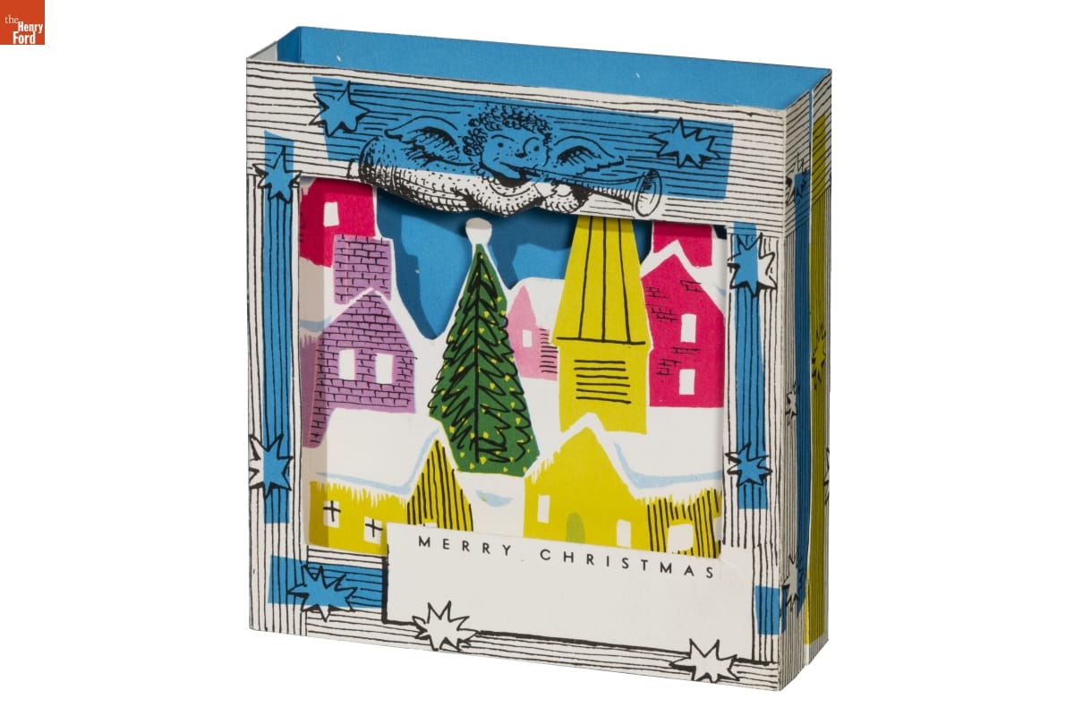 Karl Koehler designed three-dimensional Christmas cards in the late 1940s and 1950s. He folded, scored, and snipped paper printed with his artwork, then assembled the cards in his studio. Koehler's creations folded flat for mailing, but when opened they brought unexpected joy with their pop-out shapes. Holiday shoppers found his line of "Mantelpiece" cards at high-end department stores throughout the country.