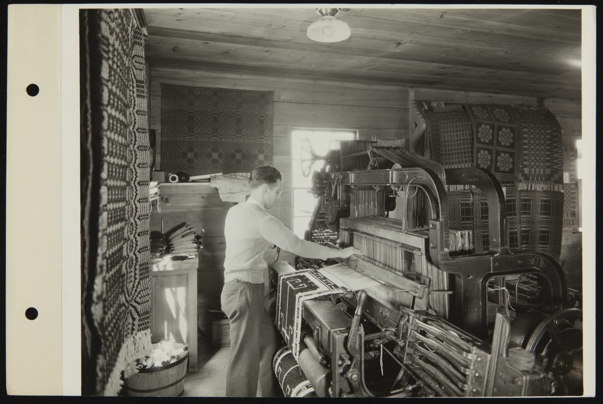 Frank Caddy at the Power Loom in Plymouth Carding Mill (now Gunsolly Carding Mill), Greenfield Village, 1935