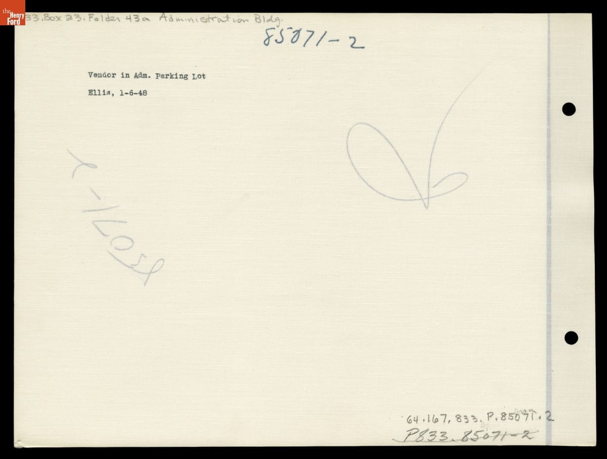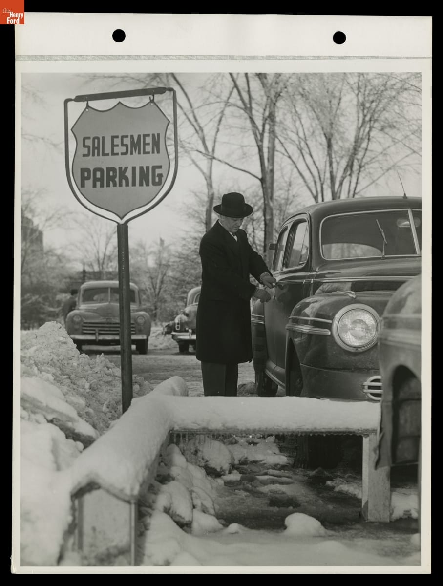 Sales staff had their own reserved parking spots outside the Administration Building at Ford Motor Company's Rouge plant, as seen in this photograph from January 1948. Presumably, most salespeople only visited the building for brief periods of time, so close and convenient parking was appreciated.