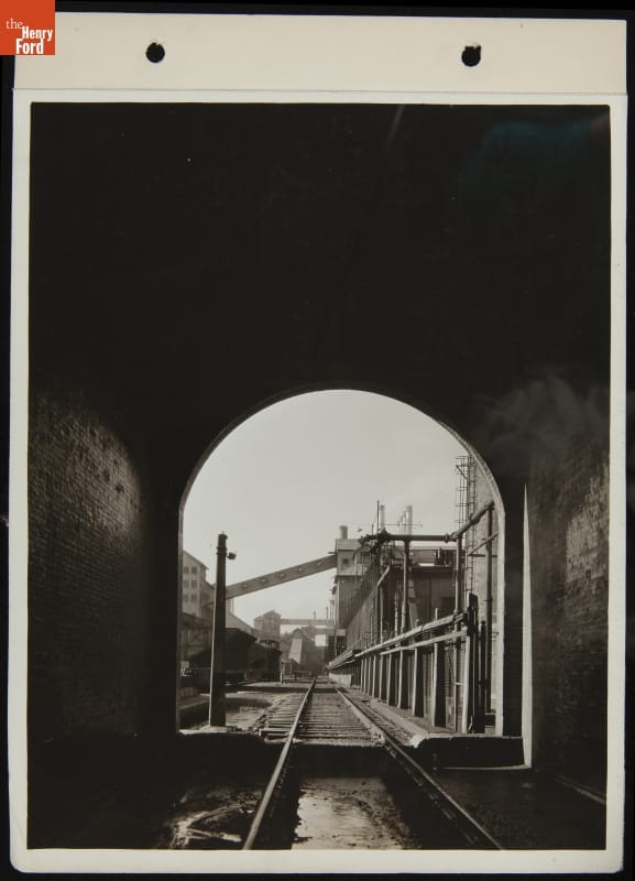 Enormous coke ovens at Ford Motor Company's Rouge plant converted coal into high-carbon coke, which was then used in the factory's blast furnaces to produce iron. This view looks back toward the coke ovens from inside the quenching tower, where a specialized railcar carrying red-hot coke was doused with thousands of gallons of water.