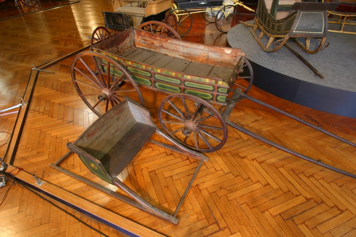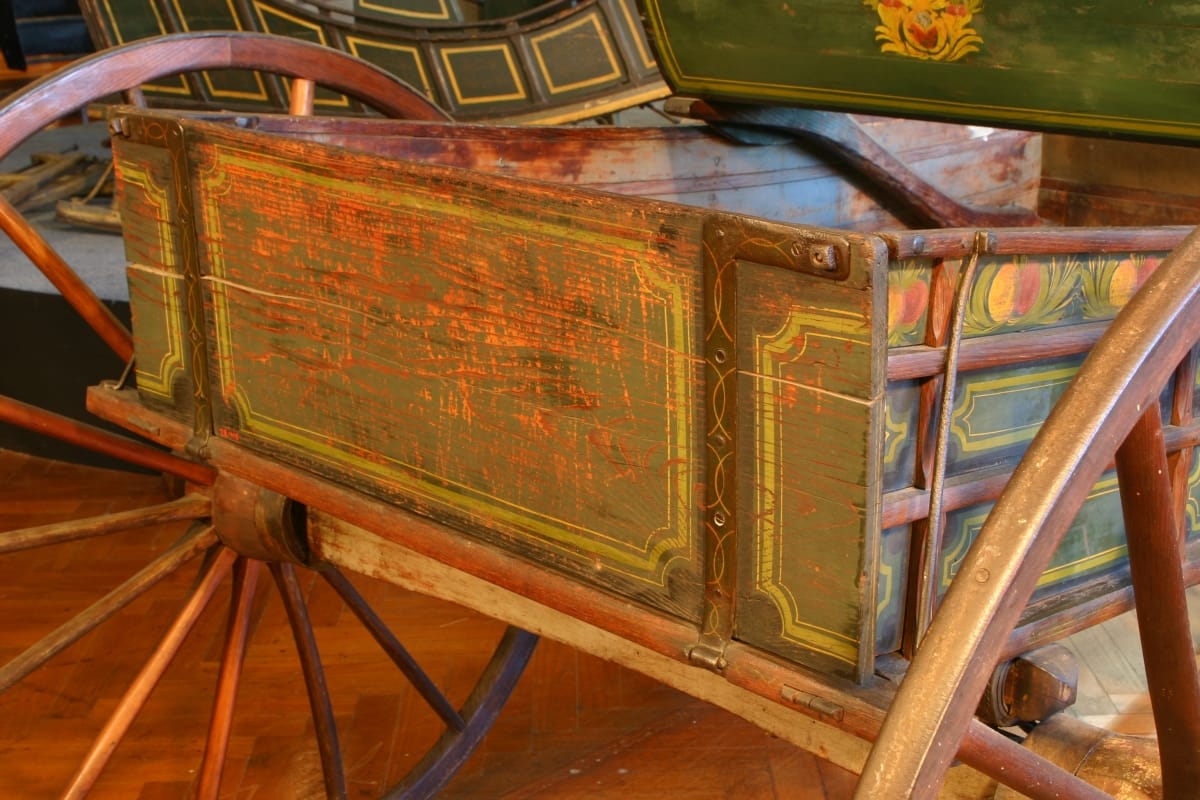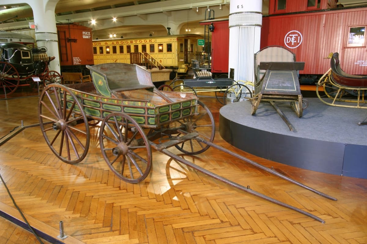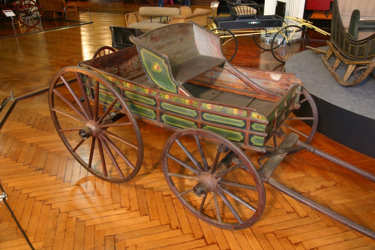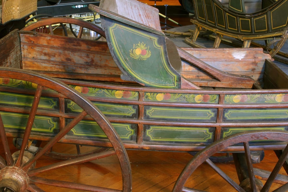 The pleasure wagon, developed in New England in the early 19th century, was pretty and practical. Its stylish body and bright paintwork were appropriate for a drive to church on Sunday. But, with its seat lifted out, the vehicle had room to carry produce to market the rest of the week. New Hampshire farmer Jonathan Fitts owned this pleasure wagon.