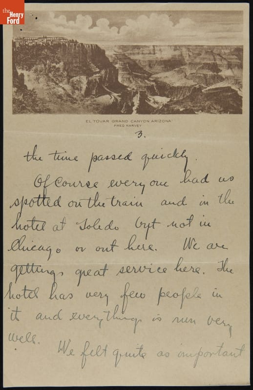 After their wedding on November 1, 1916, Edsel and Eleanor Ford traveled to the West Coast before sailing to Hawaii. Along the way, the couple stopped and visited the Grand Canyon. Edsel penned this brief letter to his parents in which he recounts some of the events during the newlyweds' stay: a blinding snowstorm, Presidential election returns, and "real cow boy life."