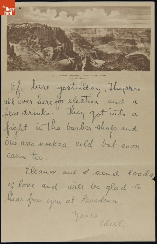 After their wedding on November 1, 1916, Edsel and Eleanor Ford traveled to the West Coast before sailing to Hawaii. Along the way, the couple stopped and visited the Grand Canyon. Edsel penned this brief letter to his parents in which he recounts some of the events during the newlyweds' stay: a blinding snowstorm, Presidential election returns, and "real cow boy life." …