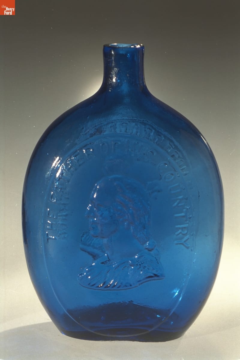 Glass factories in America began producing inexpensive, mold-formed flasks in the early 1800s. These figured flasks, often decorated with symbols of national pride, appealed to America's common man. This flask pairs Mexican War hero General Zachary Taylor with America's founding father, George Washington. The inscription around Taylor's image refers to his order to fire more artillery rounds -- and alluded to the flask's alcoholic content.