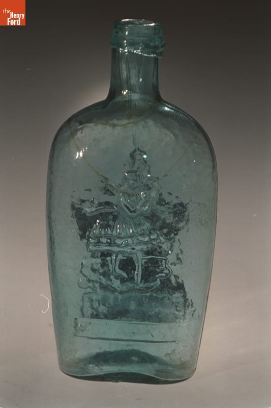 Glass factories in America began producing inexpensive, mold-formed flasks in the early 1800s. These figured flasks, often decorated with symbols of national pride or political or cultural affiliation, appealed to America's common man. Other images, like the ones on this flask, were purely decorative. To some, the imagery -- whether patriotic or pretty -- mattered little as long as the flask could hold liquid.