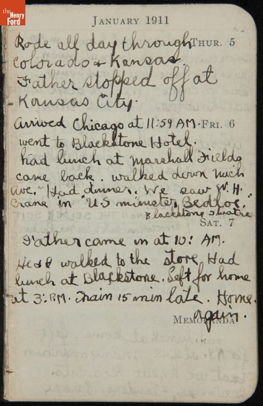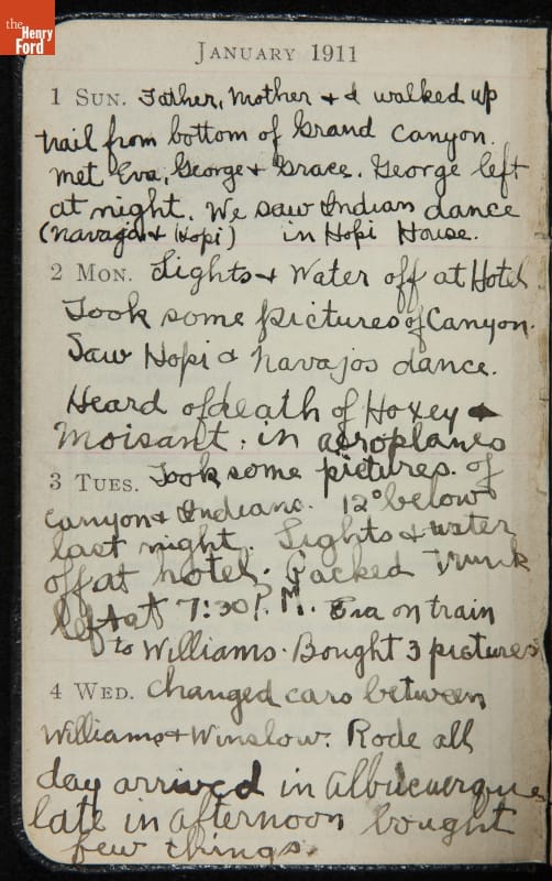 Henry Ford and his family spent the beginning of January 1911 visiting the Grand Canyon. Edsel noted in his diary that on New Year's Day he joined his parents on a hike in the canyon. Other activities included visiting with Clara's sister Eva and her husband, watching Native American dances in the Hopi House, and photographing the canyon.