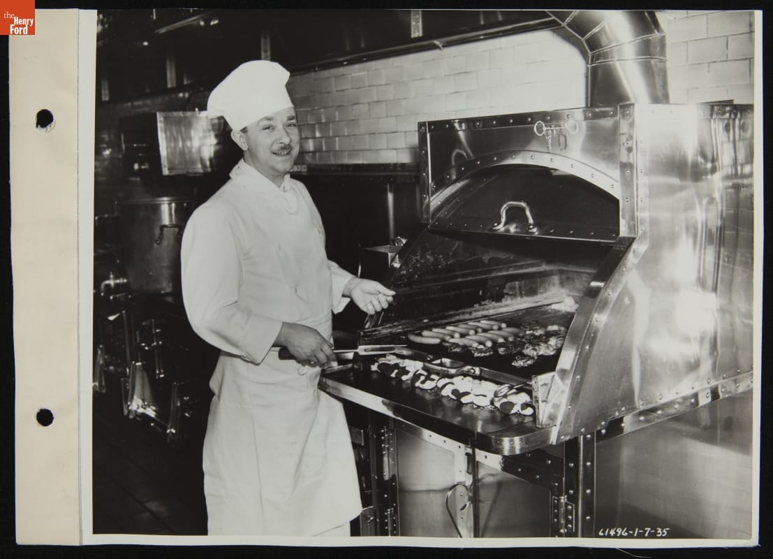 Chef Broiling Steak and Hot Dogs over Ford Charcoal Briquets, 1938