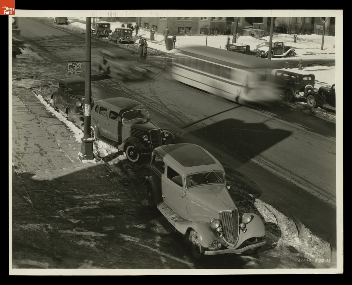 Ford V-8 Automobiles Parked under a No Parking Sign, 1935