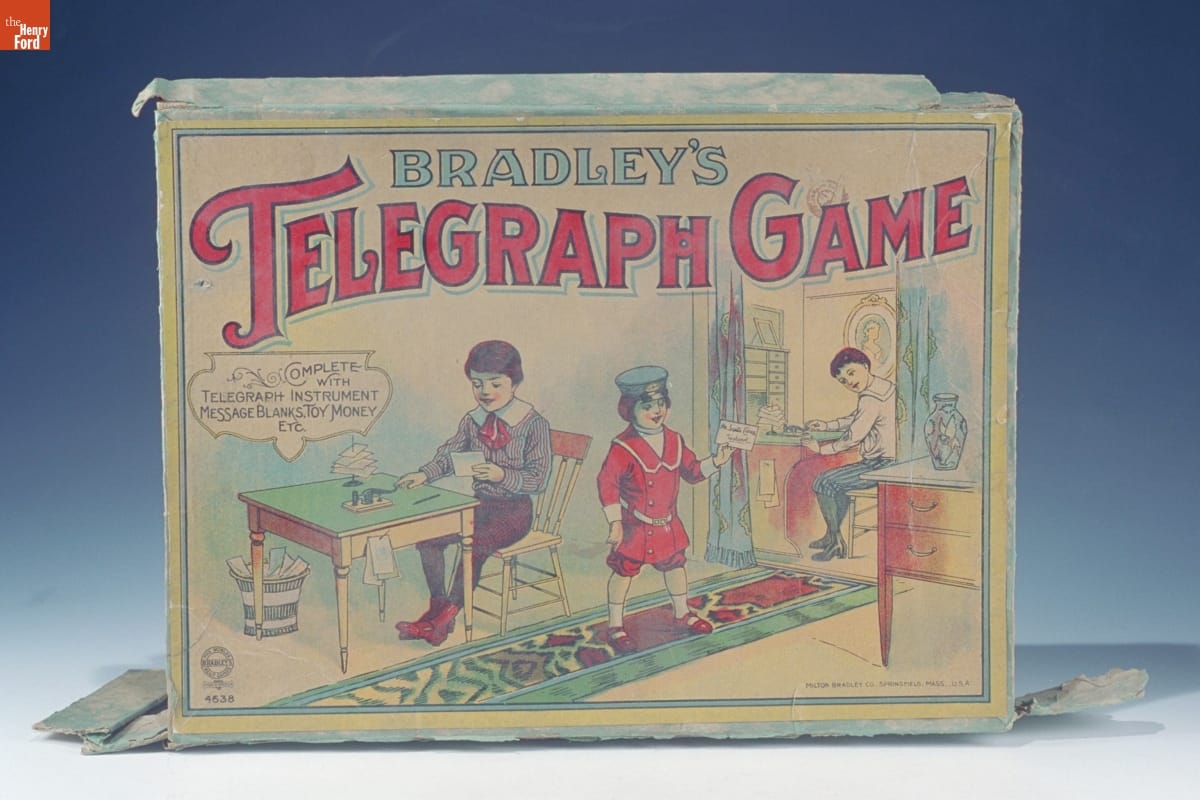 Children in the early 1900s could imagine they ran a telegraph office with this play set. This box once held a copy of the Morse code, blank telegrams, rubber stamps and two telegraph tickers to create the dots and dashes needed to send messages. This role-playing provided children with valuable learning experiences and helped them develop social skills.