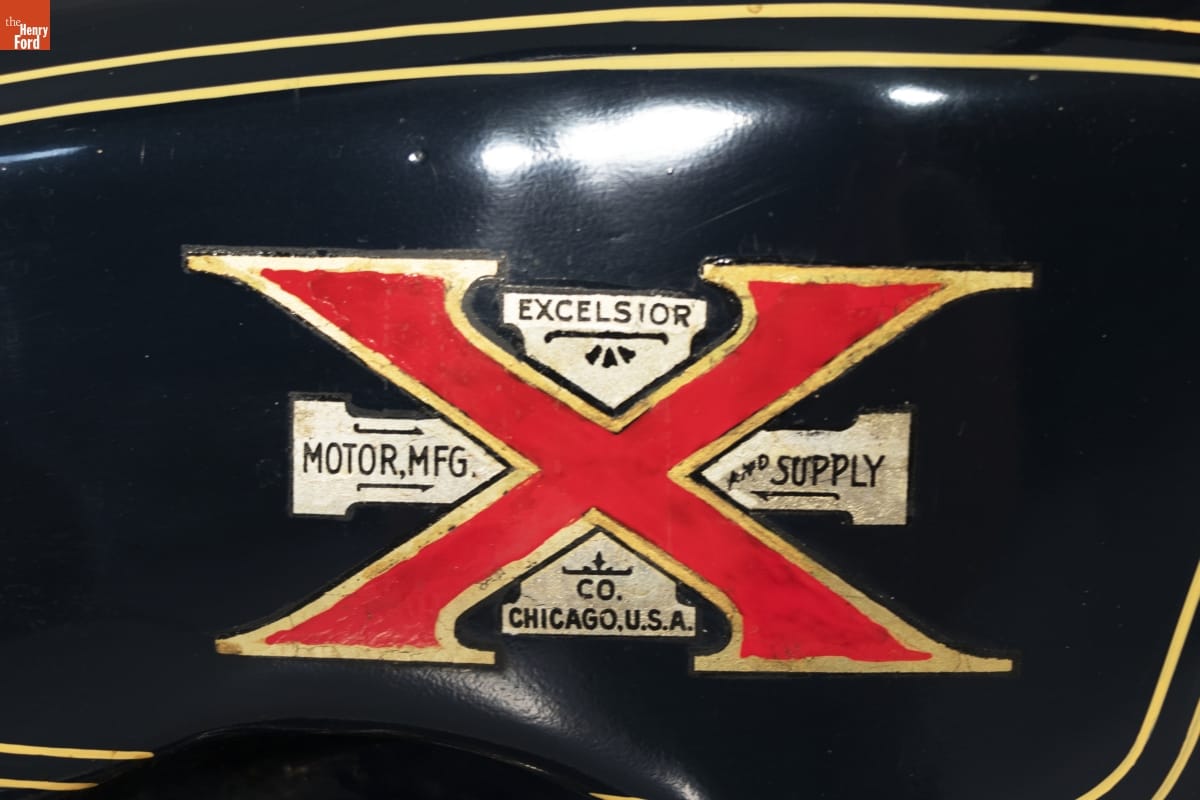 Saddle: MESINGER / [in a circle] / CUSHION SUSPENSION Gas tank: In "X" logo upper quadrant: EXCELSIOR Left quadrant: Motor Co. Right quadrant: and / Supply Bottom quadrant: Chicago, USA On tire: DUNLAP TIRES DUNLAP CORD MOTORCYCLE EXTRA HEAVY MADE IN ENGLAND