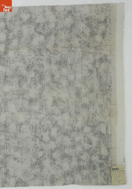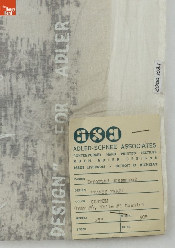 on front of paper tag: asa / ADLER-SCHNEE ASSOCIATES / CONTEMPORARY HAND PRINTED TEXTILES / RUTH ADLER DESIGNS / [...] / FABRIC Imported Dreamspun / DESIGN "FANCY FREE" / COLOR CUSTOM / Gray #6, White#1 Cennini / REPEAT 25" / WIDTH 50" / STOCK / PRICE