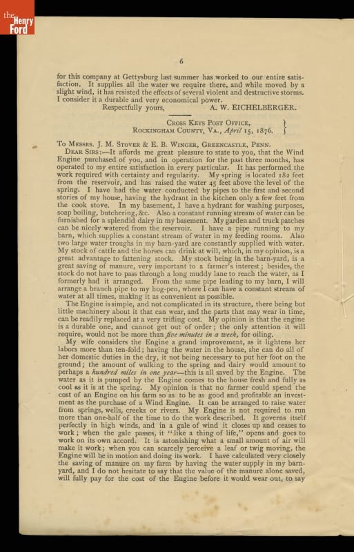 Many American farmers in the late 1800s bought windmills to pump water and power machinery. The Stover Wind Engine Company -- one of several companies that used the Stover name -- manufactured windmills for a brief period around the late 1870s. With pages of testimonials, this Stover catalog touted the durable construction and labor- and money-saving qualities of its windmills.
