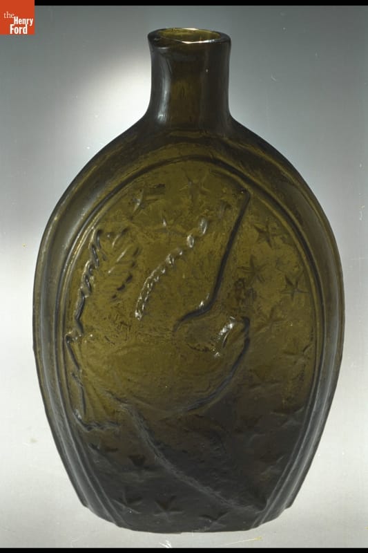 Glass factories in America began producing inexpensive, mold-formed flasks in the early 1800s. These figured flasks, often decorated with symbols of national pride or political or cultural affiliation, appealed to America's common man. Americans' fascination with railroads began in the late 1820s when rail lines began connecting distant communities. Early flasks depicted horses, an alternative to steam engines, hauling freight down railway tracks.