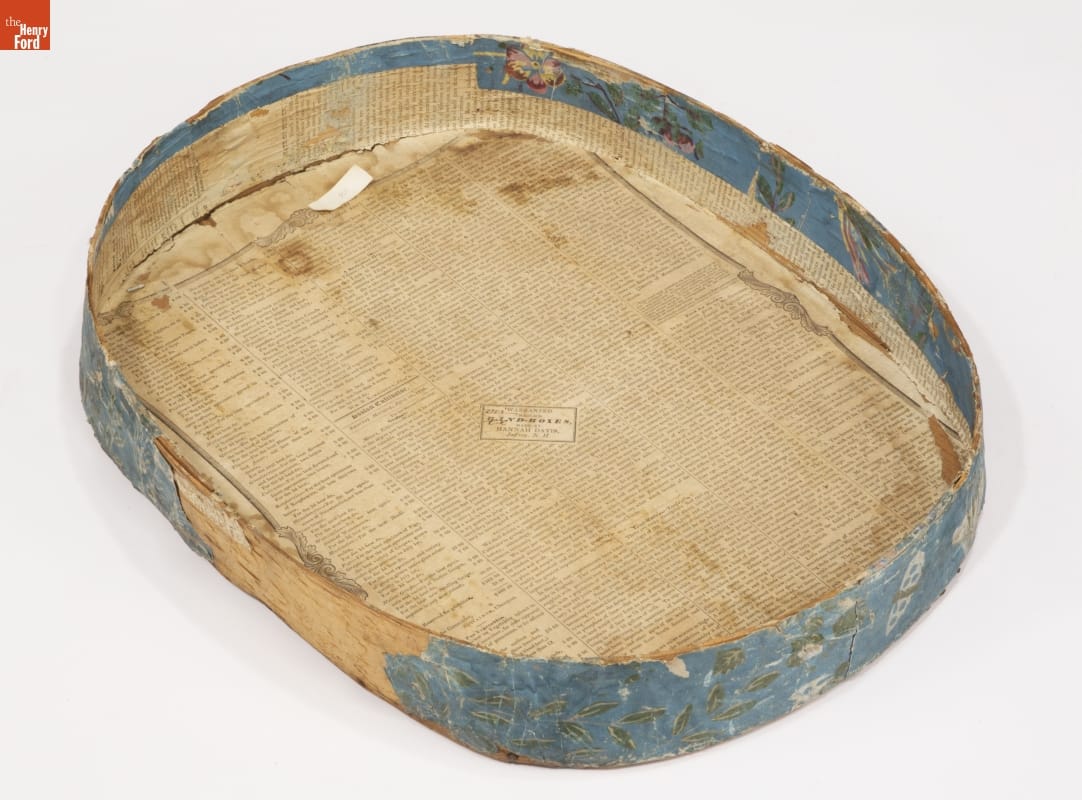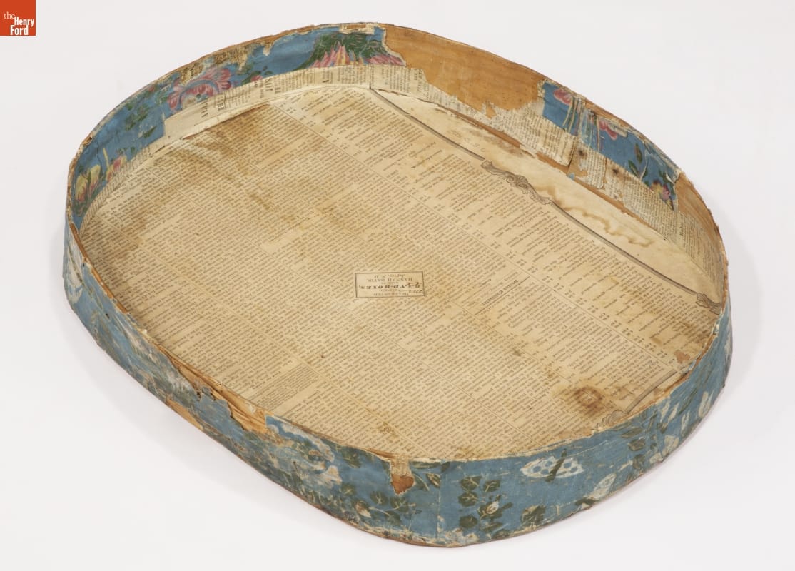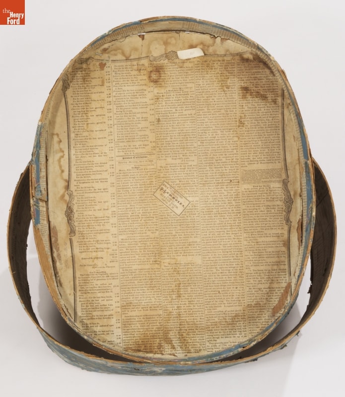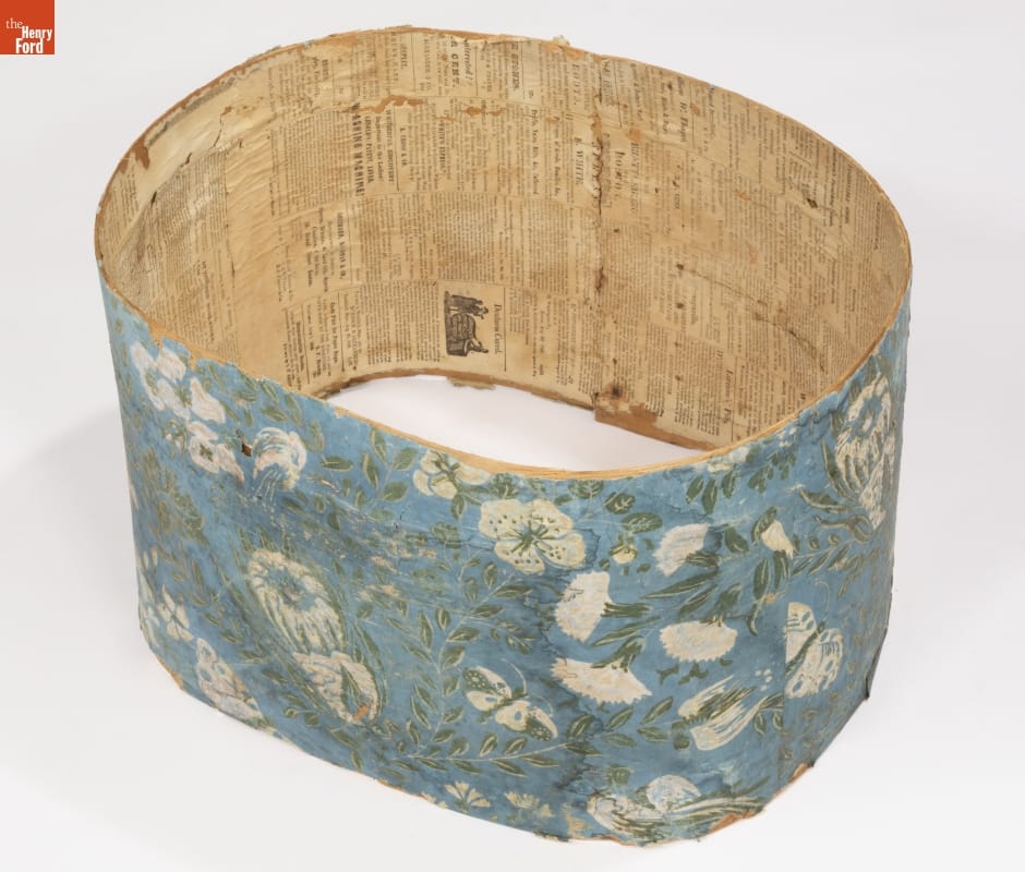 Hannah Davis (1784-1863), a Jaffrey, New Hampshire, entrepreneur, created colorful, wallpaper-covered bandboxes. Davis sold many of her bandboxes to the young, migrant women who worked in the textile mills in the surrounding New England villages. Davis's attractive and affordable bandboxes were ideal for the millworkers. The boxes could hold clothing and accessories and they served as useful storage cases when the women traveled home.