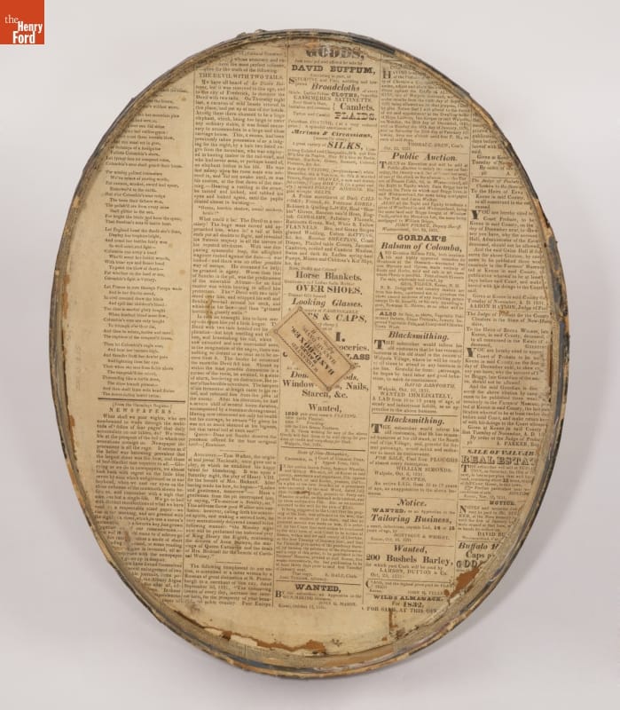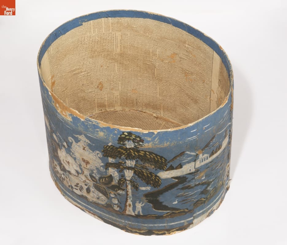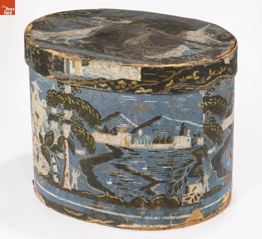 Hannah Davis (1784-1863), a Jaffrey, New Hampshire, entrepreneur, created colorful, wallpaper-covered bandboxes. Davis sold many of her bandboxes to the young, migrant women who worked in the textile mills in the surrounding New England villages. Davis's attractive and affordable bandboxes were ideal for the millworkers. The boxes could hold clothing and accessories and they served as useful storage cases when the women traveled home.