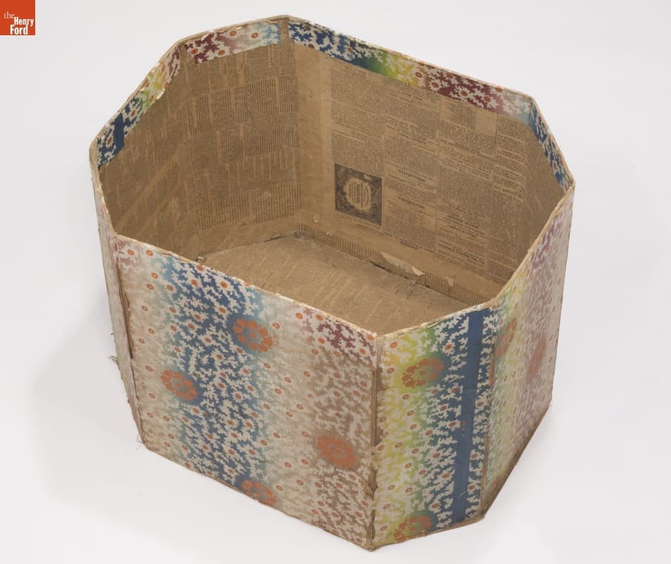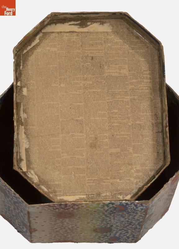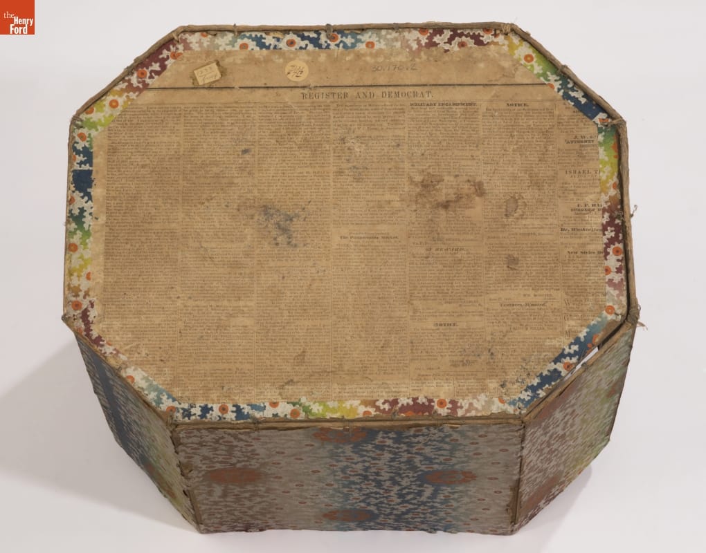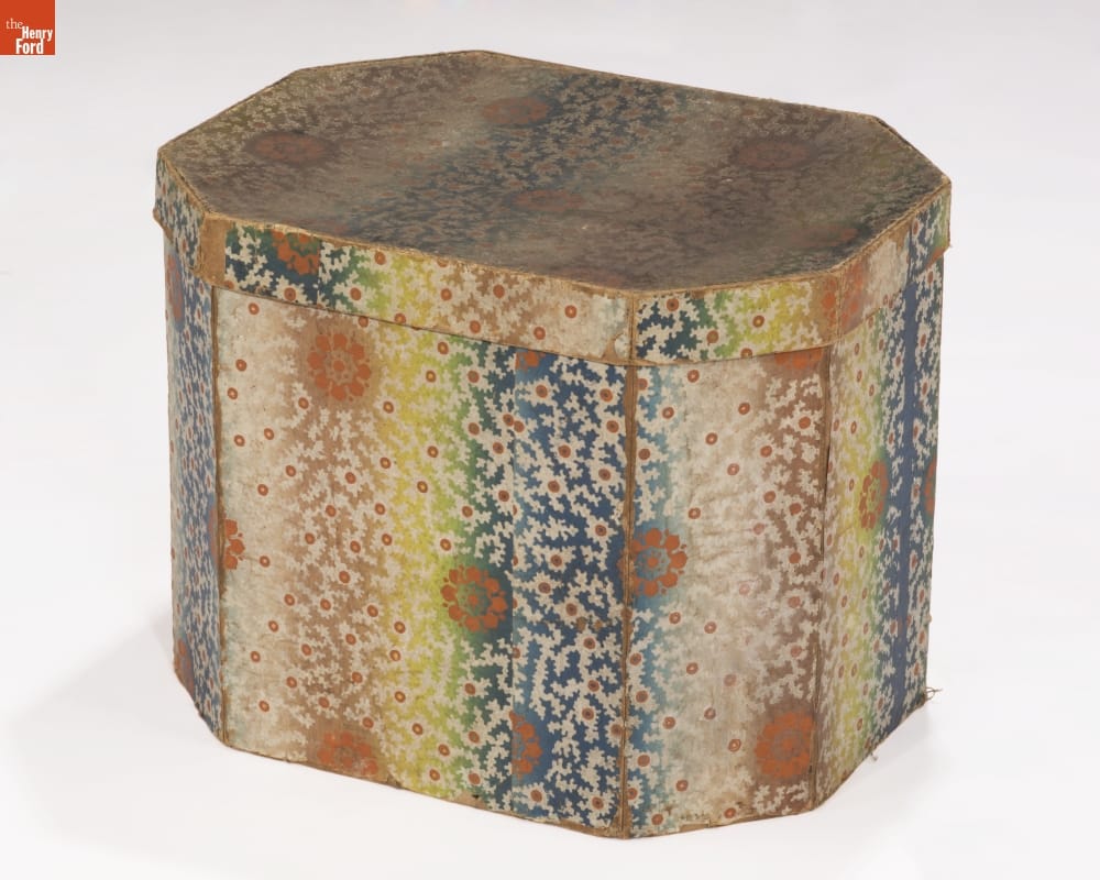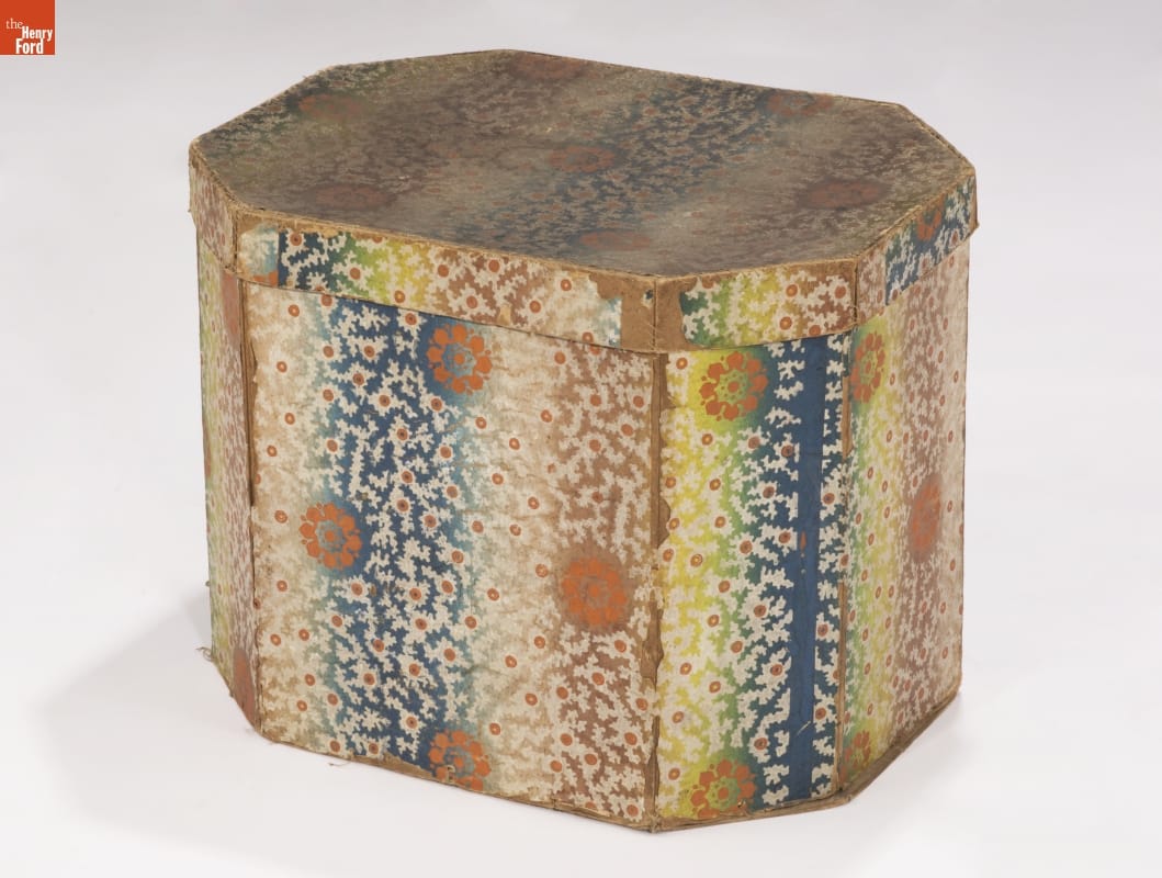 In the early 1800s, Americans used bandboxes to store clothing, accessories, and other small items. Bandboxes were handy containers in the home, or when traveling by stage, boat, or rail. Manufacturers covered these inexpensive pasteboard or wooden boxes with colorful papers. Some bandboxes were covered with papers depicting animals, places or specific scenes. Others, such as this one, were covered with decorative wallpaper of the day.