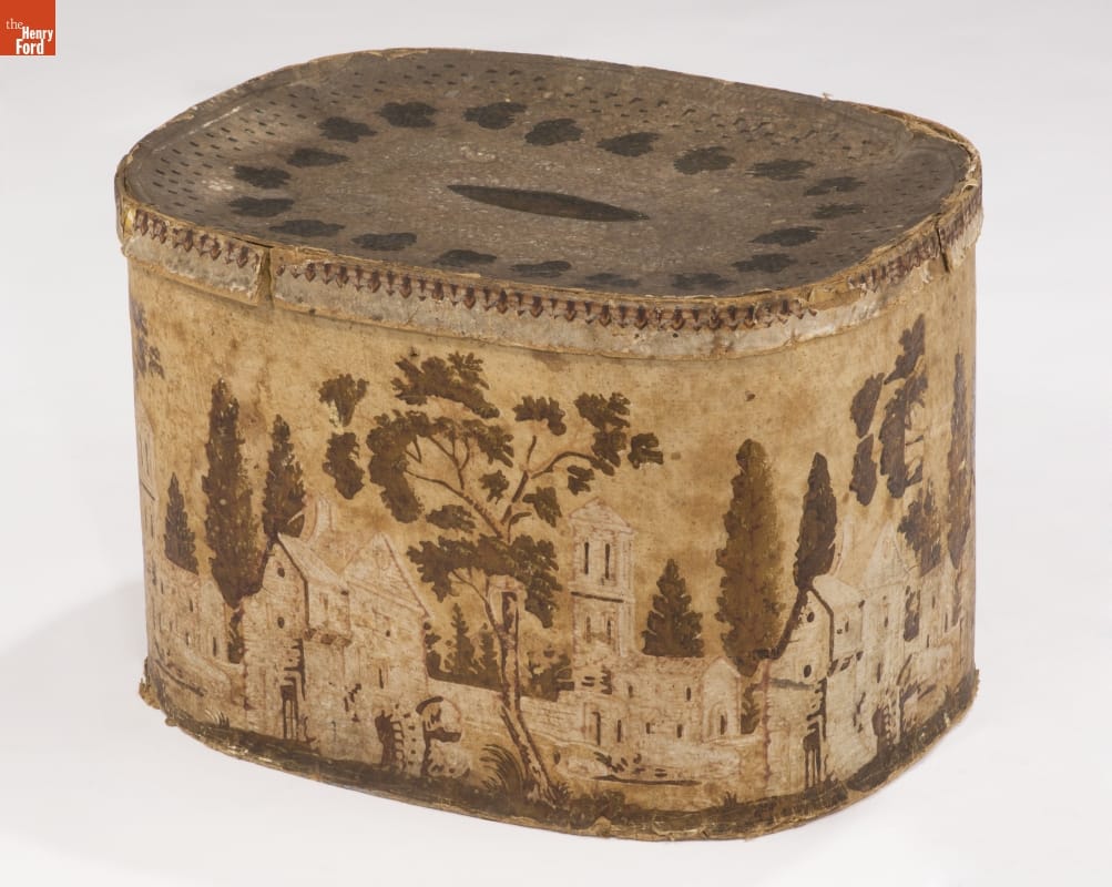 In the early 1800s, Americans used bandboxes to store clothing, accessories, and other small items. Bandboxes were handy containers in the home or when traveling by stage, boat, or rail. Manufacturers covered these inexpensive pasteboard or wooden boxes with colorful papers. This bandbox's paper depicts an idyllic scene with a towered home and mill.