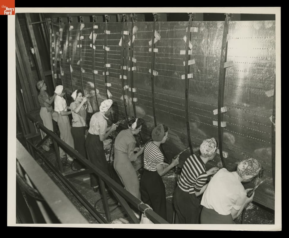 Women represented approximately one third of the workers at Ford Motor Company's Willow Run plant during World War II. Women did everything from clerical work in the offices to riveting and welding on the assembly line. Labor shortages made women essential to war industries, and the government actively recruited them to join the workforce.