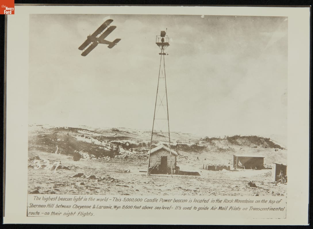 Early pilots depended on visual landmarks, preventing reliable nighttime navigation. When the postal service took to the skies with transcontinental mail delivery, a lighted pathway was formed to guide pilots at night. Throughout the 1920s, a series of powerful light beacons was built, eventually stretching from New York to San Francisco. This Wyoming beacon is the mid-point of the route.