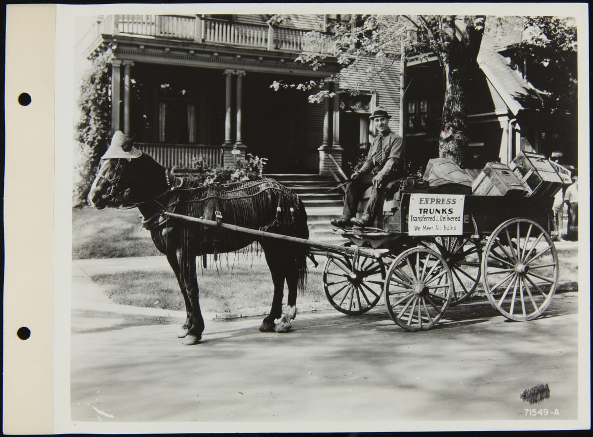 Horse-Drawn Delivery Wagon, "Express Trunks Transferred & Delivered, We Meet All Trains," 1939