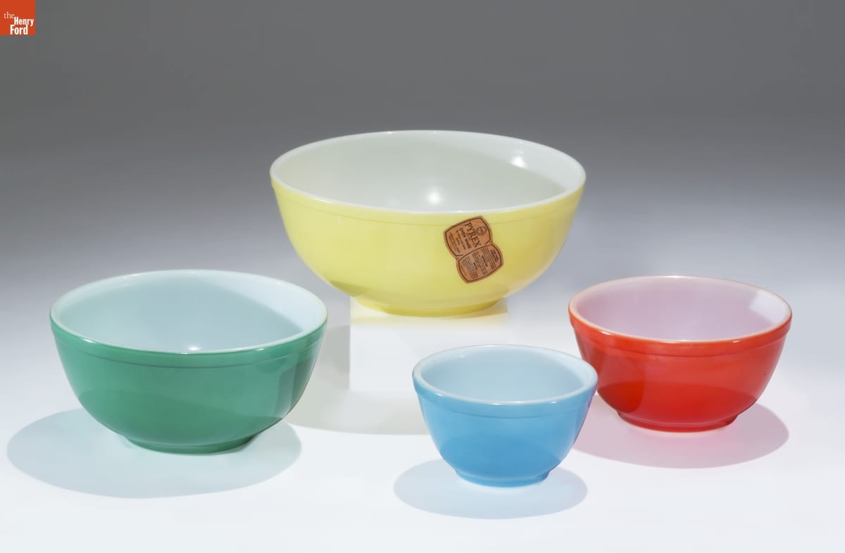 Corning Glass Works' heat-resistant glass bakeware, called Pyrex, was introduced in the mid-1910s. Pyrex products were inexpensive, with an easy-to-clean smooth surface. Pyrex glassware could travel from refrigerator to oven to table. Colored Pyrex kitchenware was introduced in 1947. These appealing mixing bowl sets, made from 1949 to 1957, were among the most popular of Corning's Pyrex products ever made.
