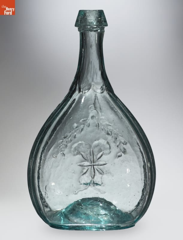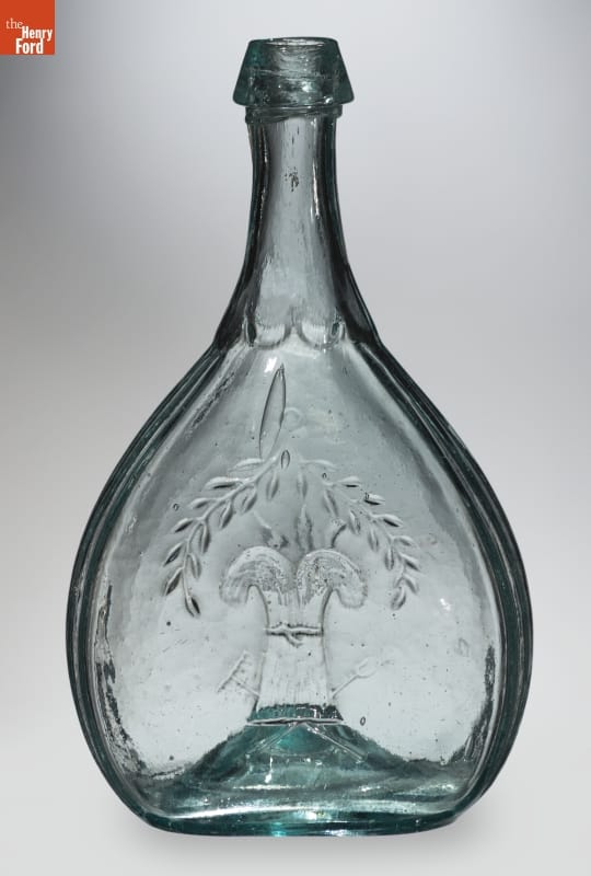 Glass factories in America began producing inexpensive, mold-formed flasks in the early 1800s. These figured flasks, often decorated with symbols of national pride, appealed to America's common man. This calabash -- a gourd-like form popular in the mid-19th century -- contains an image of a sheaf of grain. This symbol of agriculture also may allude to the flask's content of grain-based alcohol.