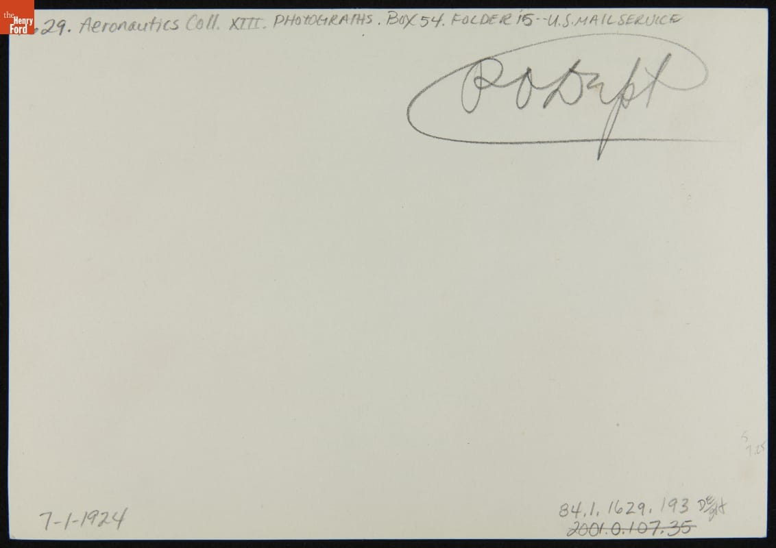on front: Omaha. July 1, 1924- All photos made by use of field flood lights / Loading plane for the west - E. M. Ellison - pilot