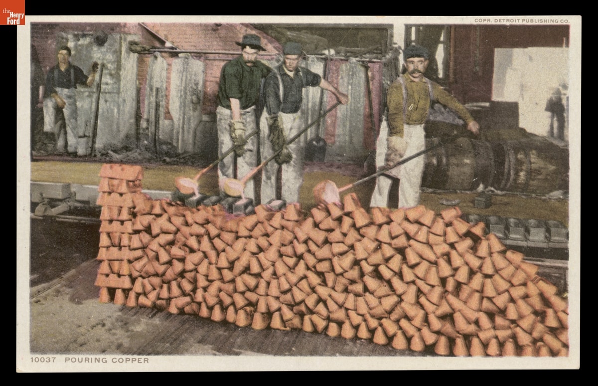 Printed at bottom edge of postcard: 10037 POURING COPPER Text at upper right front corner: COPR. BY DETROIT PUBLISHING CO.