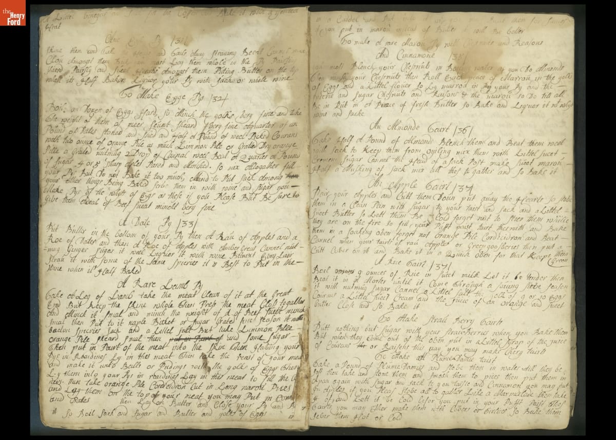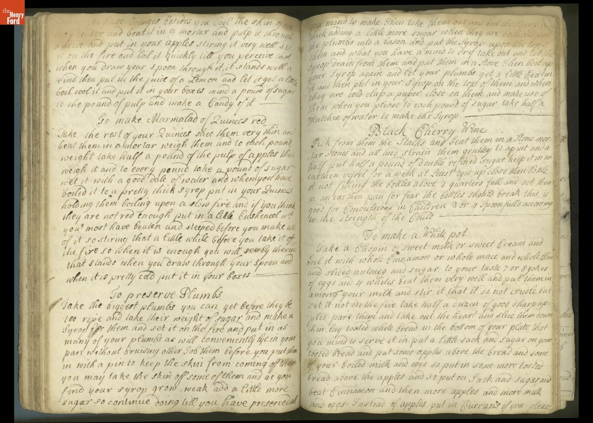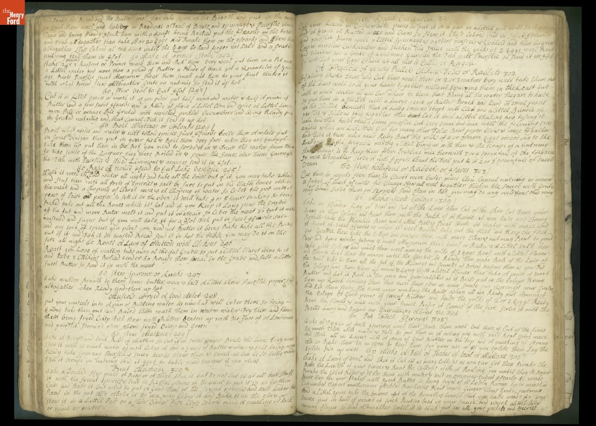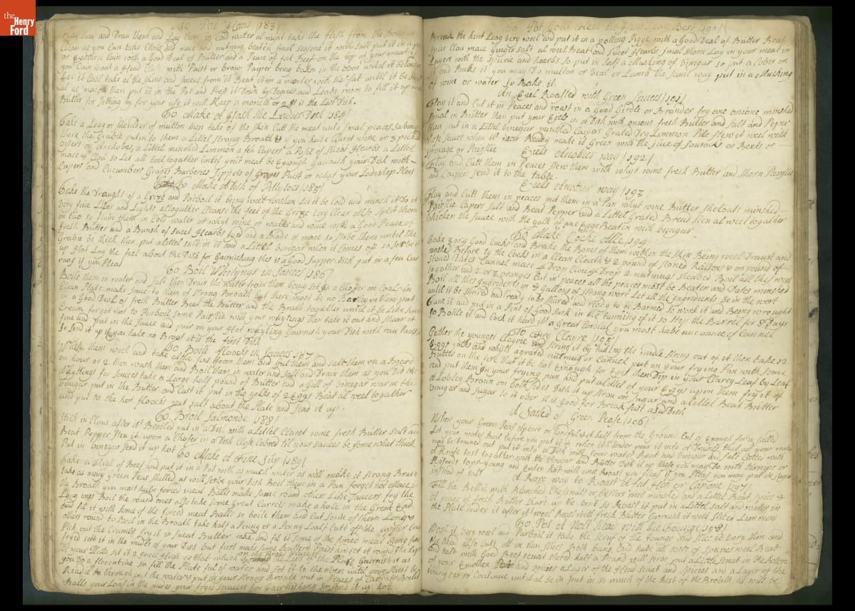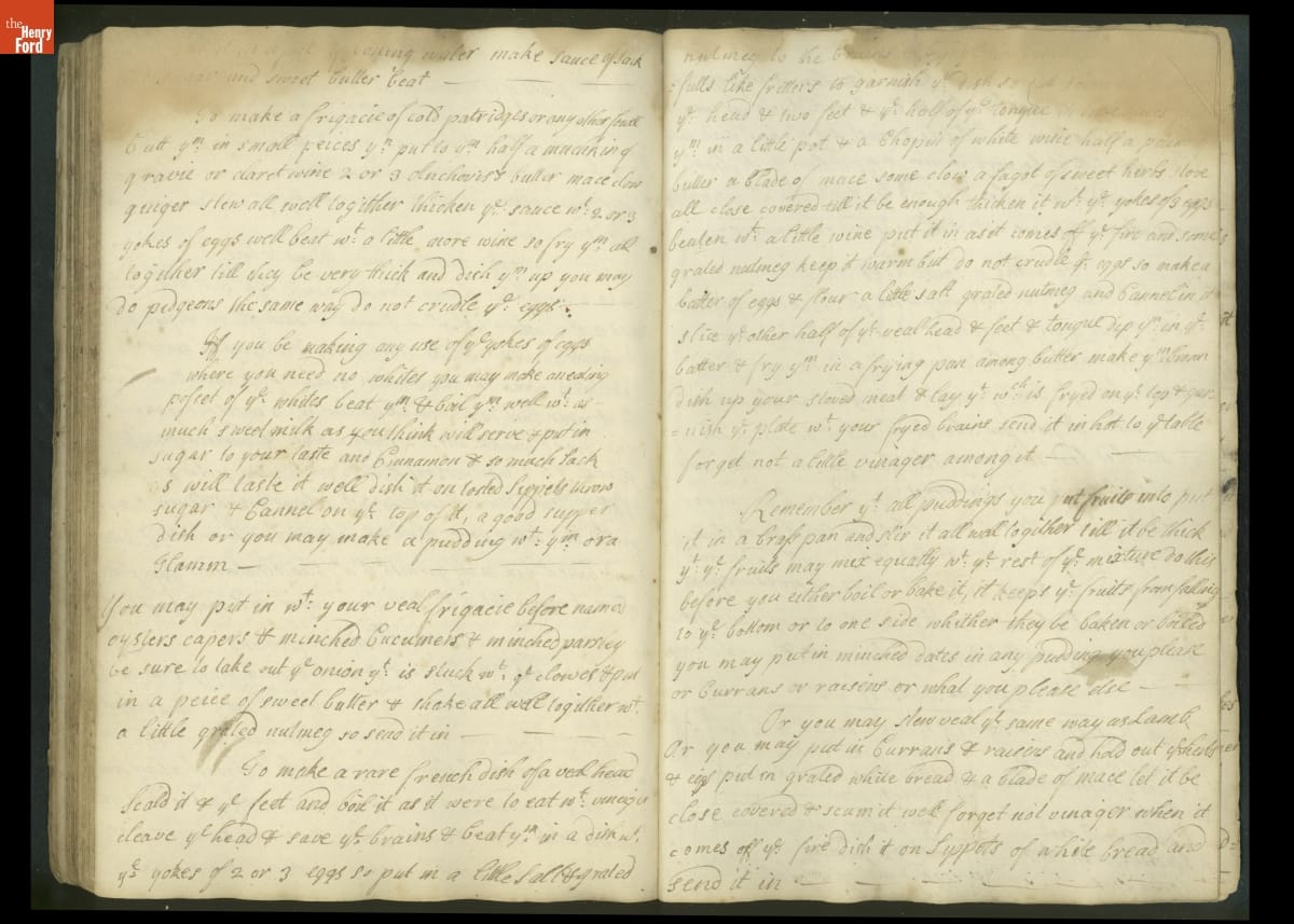 Colonial housewives used recipes handed down from mother to daughter by word of mouth. Women who could read and write might copy down their family recipes in manuscript cookbooks like this one.