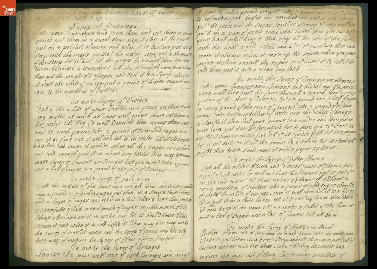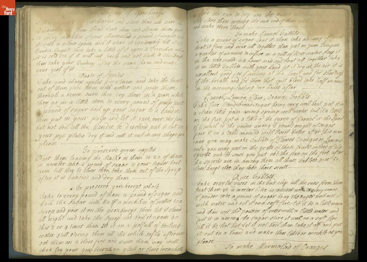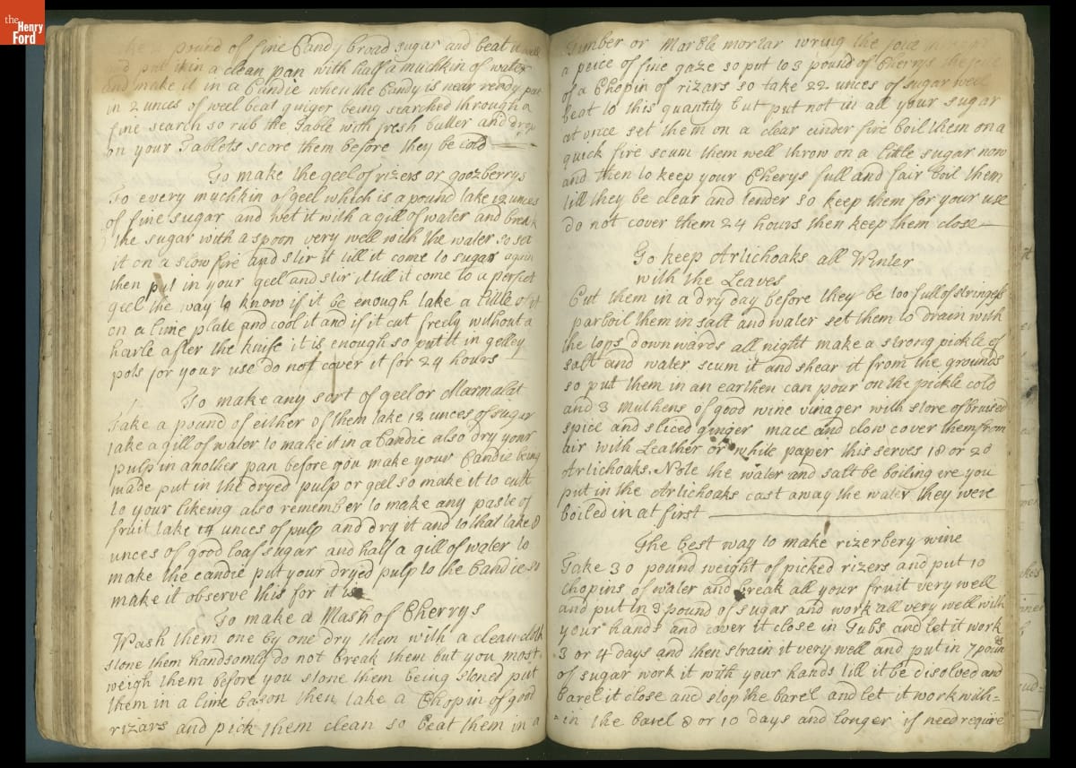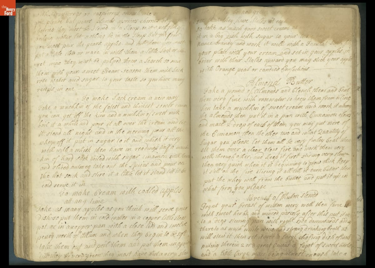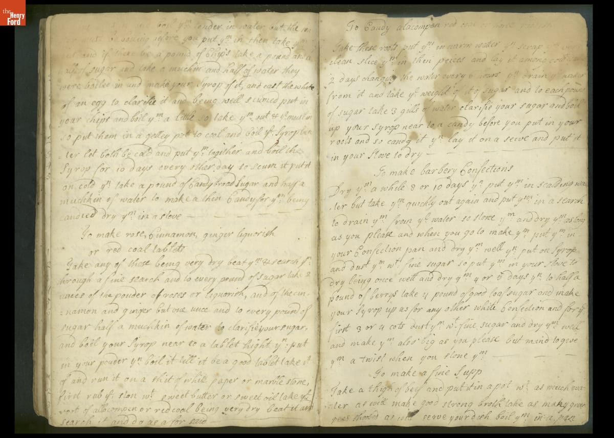 Colonial housewives used recipes handed down from mother to daughter by word of mouth. Women who could read and write might copy down their family recipes in manuscript cookbooks like this one.