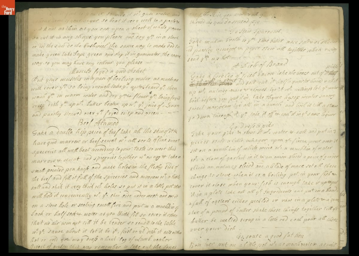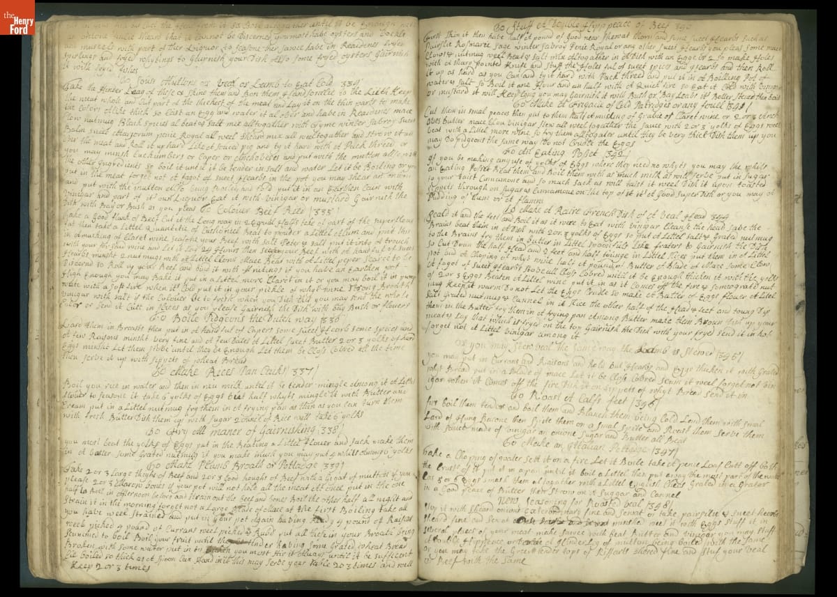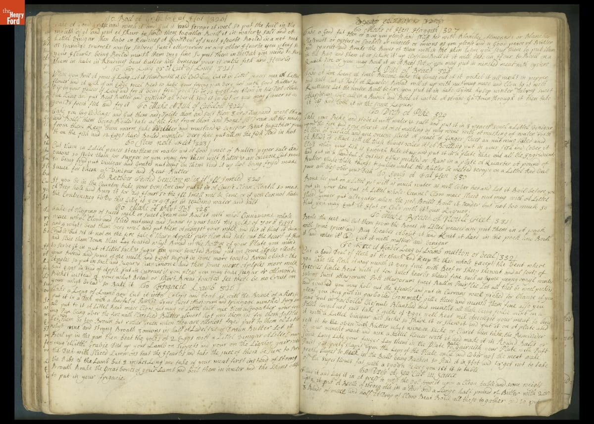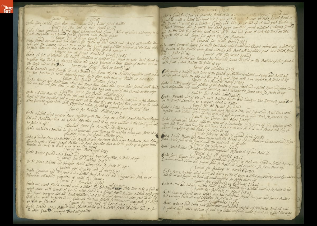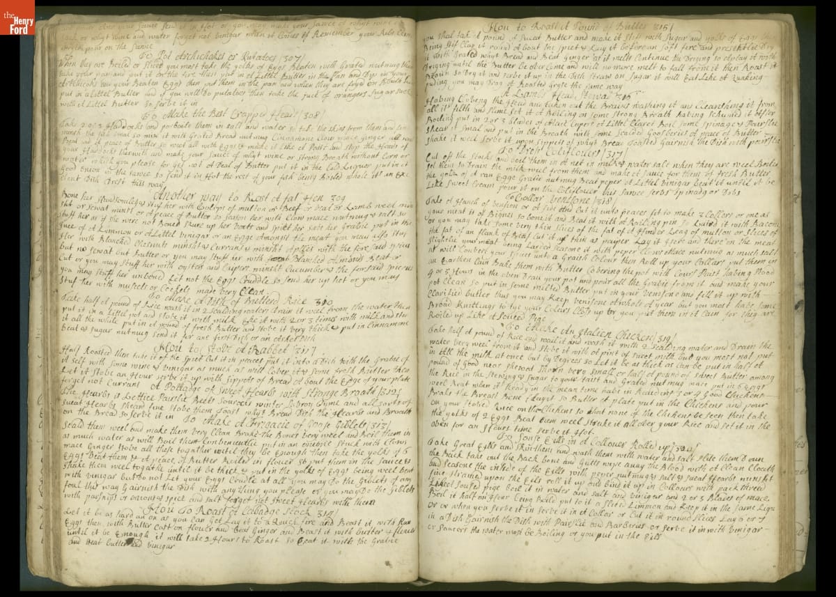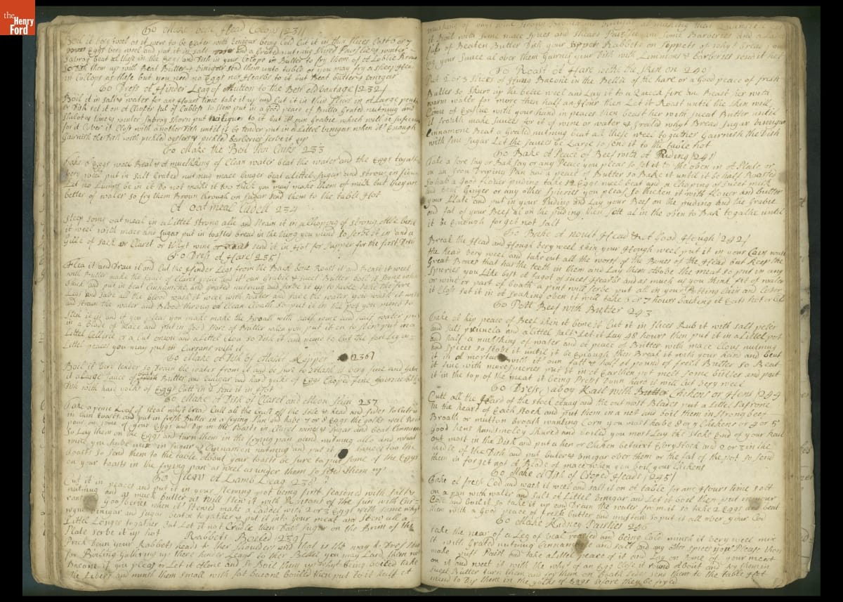 Colonial housewives used recipes handed down from mother to daughter by word of mouth. Women who could read and write might copy down their family recipes in manuscript cookbooks like this one.