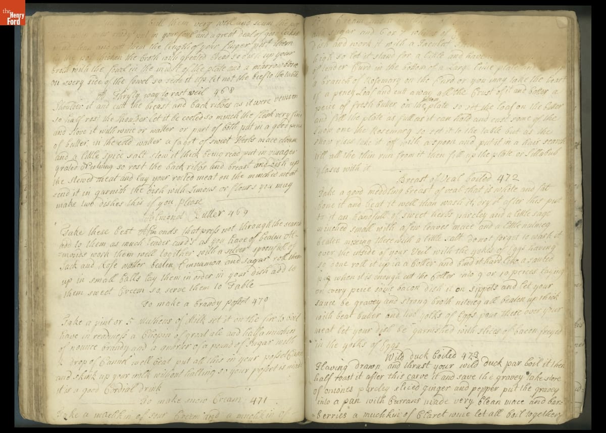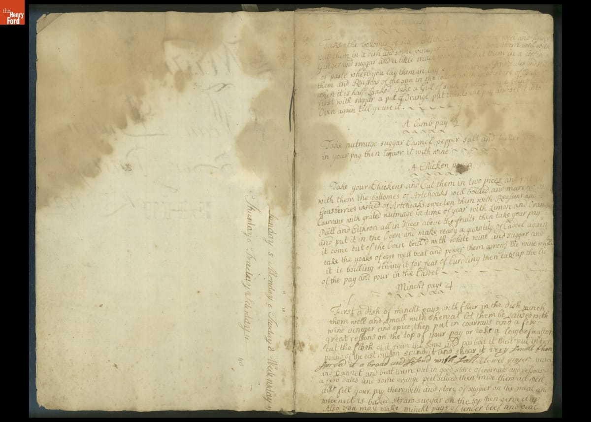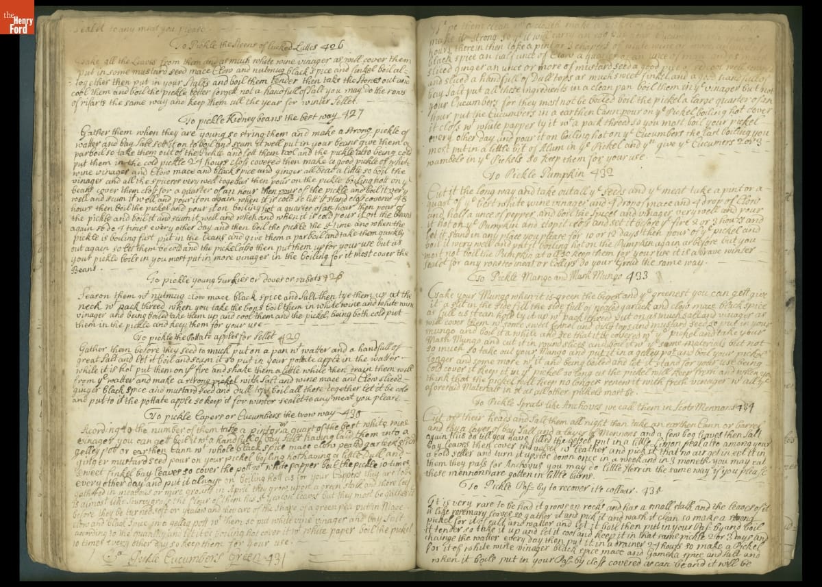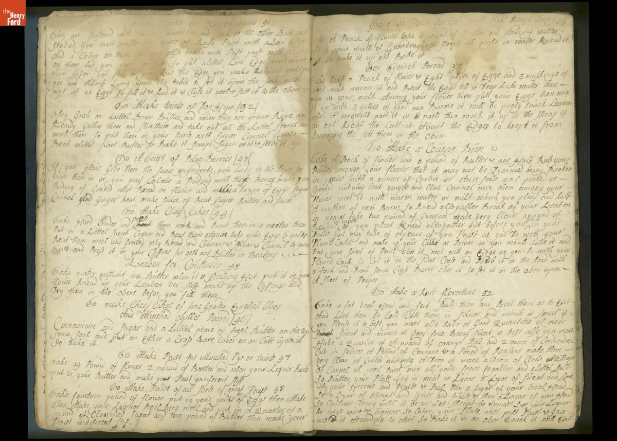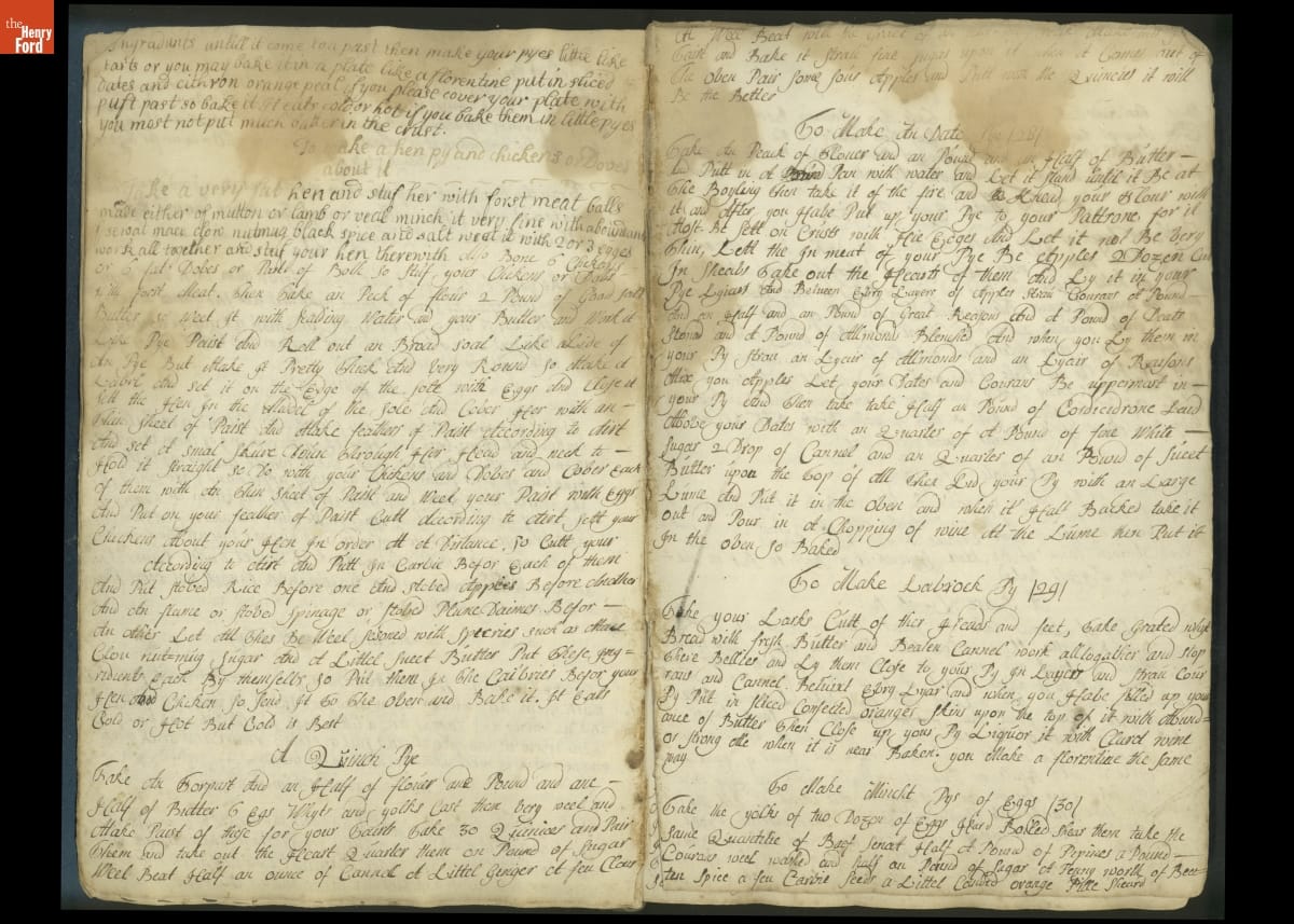 Colonial housewives used recipes handed down from mother to daughter by word of mouth. Women who could read and write might copy down their family recipes in manuscript cookbooks like this one.