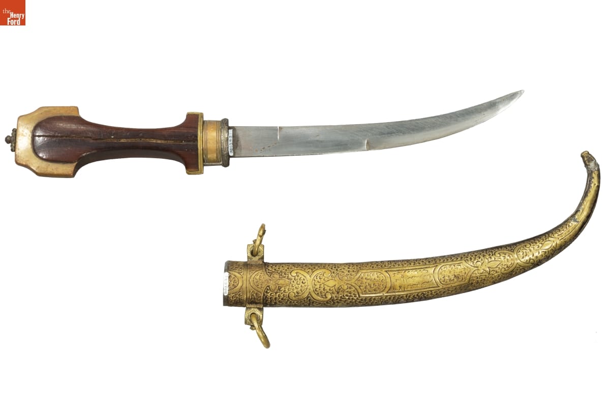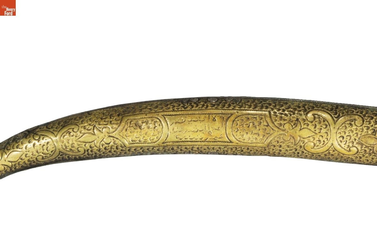 A jambiya is a curved dagger worn close to the body and used for close-at-hand defense. This Moroccan example, from the late 19th or early 20th century, was probably a tourist trade good created for Western consumption. The chasing was executed in a cursory fashion and the inscription, which contains what looks to be Arabic calligraphy, has no meaning.