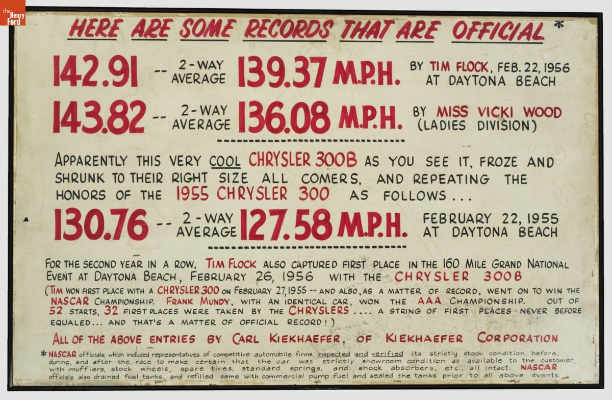Cark Kiekhaefer's team dominated NASCAR in 1955 and 1956. It was the most professional squad in stock car racing, with top drivers, well-rehearsed pit crews, and fast Hemi-powered Chrysler 300s. This sign boasts a few of the official speed records set by drivers Tim Flock and Vicki Wood during those two seasons.