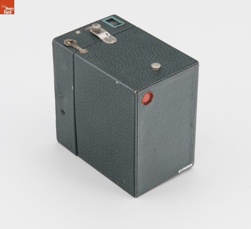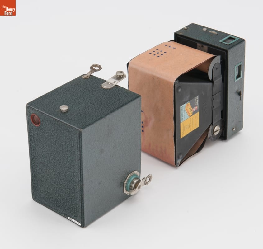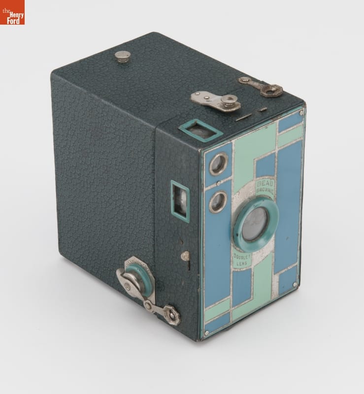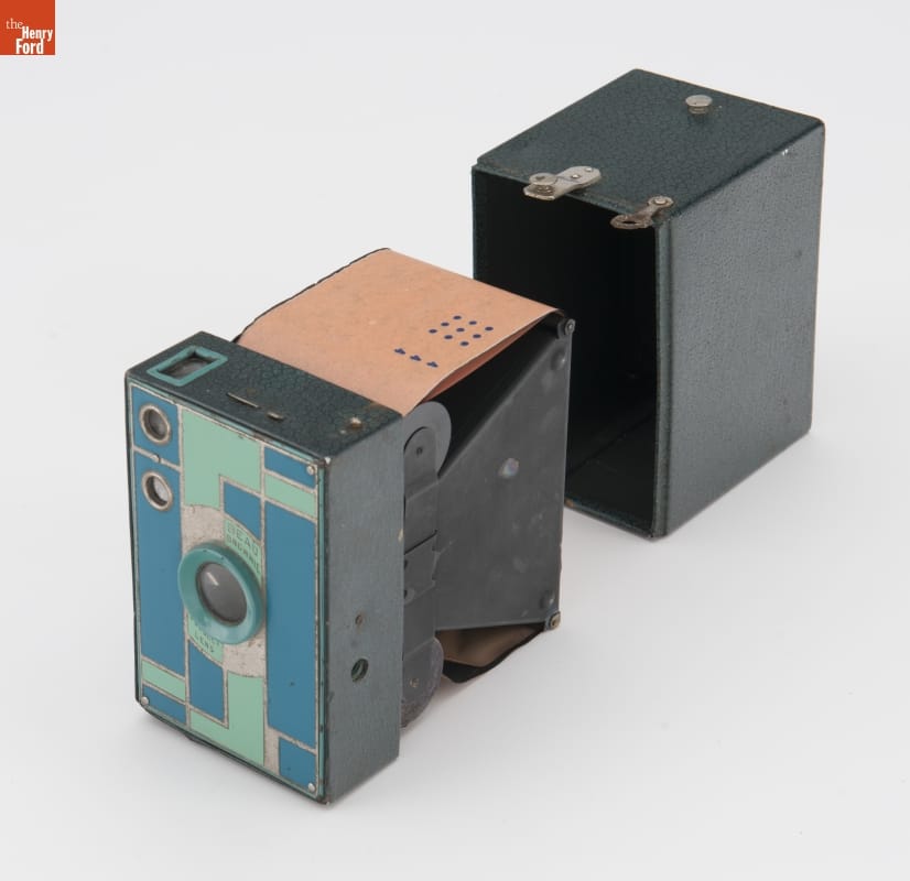 Renowned industrial designer Walter Dorwin Teague's longstanding collaboration with Kodak yielded numerous modernized camera designs, including this Kodak Beau Brownie 2A camera. Teague pioneered the merging of art and industry during this period -- his collaboration with Kodak was just one of his many commercial partnerships. The Beau Brownie came in five color choices, but this green-aqua combination was only produced for three months.