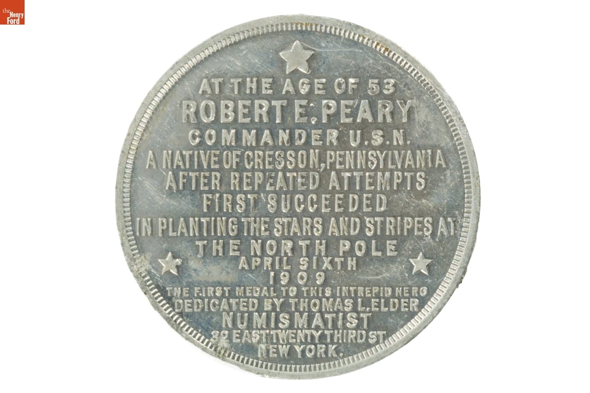 PEARY RAISED THIS FLAG / WHO WILL RAISE THE OTHER? [obverse] AT THE AGE OF 53 / ROBERT E. PEARY / COMMANDER U.S.N. / A NATIVE OF CRESSON, PENNSYLVANIA / AFTER REPEATED ATTEMPTS / FIRST SUCCEEDED / IN PLANTING THE STARS AND STRIPES AT / THE NORTH POLE / APRIL SIXTH / 1909 / THE FIRST MEDAL TO THIS INTREPID HERO / DEDICATED BY THOMAS L. ELDER / NUMISMATIST / 32 EAST TWENTY THIRD ST. / NEW YORK. [reverse]
