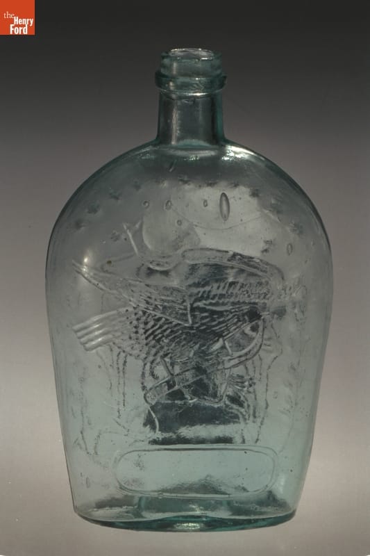 Glass factories in America began producing inexpensive, mold-formed flasks in the early 1800s. These figured flasks, often decorated with symbols of national pride or political or cultural affiliation, appealed to America's common man. The clasping hands, shield and eagle represent the Union -- a cause many Americans fought to uphold during the Civil War.