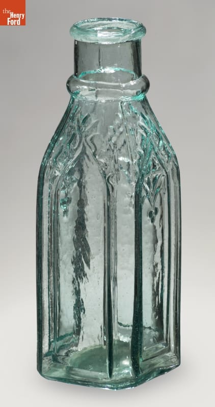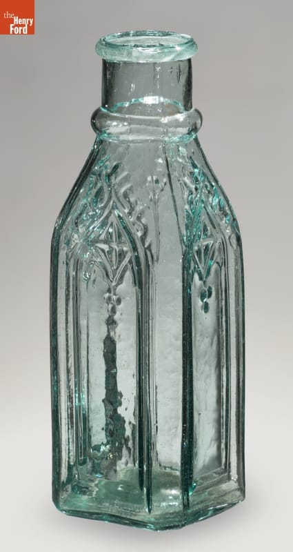 Americans in the mid-to-late 19th century purchased a variety of pickled and preserved foods in inexpensive, commercially made glass containers. Though cheap, some of these utilitarian bottles were distinctive in their decorations. This gothic-inspired bottle with its pointed arches and trefoils appealed to the tastes of many 19th-century middle class Americans and was found sitting on pantry and cupboard shelves, or atop kitchen tables.