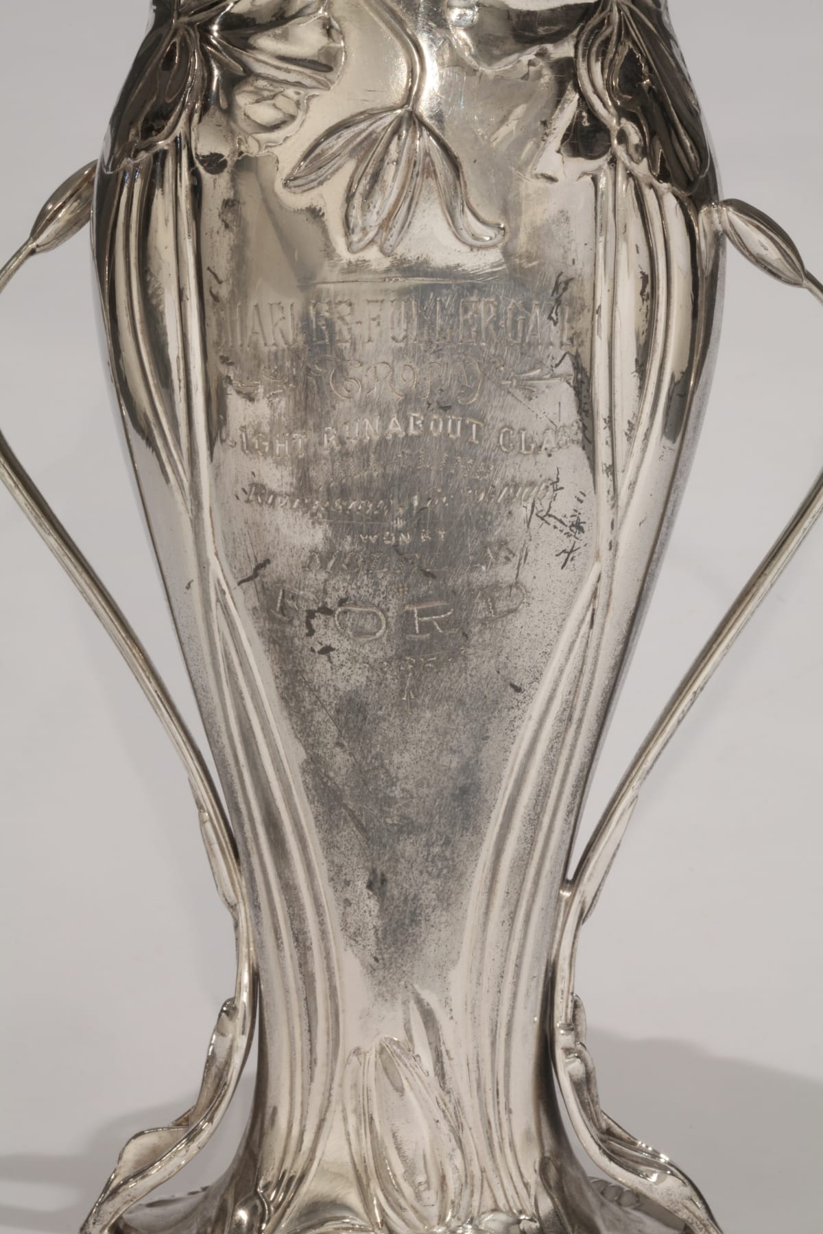 Engraved on obverse: CHARLES FULLERGATE / TROPHY / LIGHT RUNABOUT CLASS / HILL CLIMB / RIVERSIDE, NOV 29-1906 / WON BY / MODEL N. / FORD Handwritten on sticker on front: F 125 Bottom: PAIRPOINT MFG. CO / NEW BEDFORD MASS / QUADRUPLE PLATE / PAT APL'D FOR / 3398