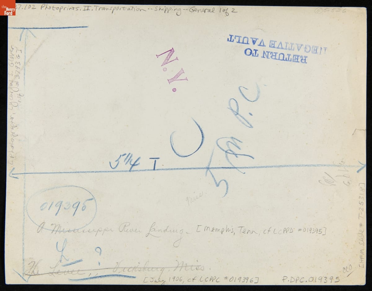 African-American workers carry cargo from horse-drawn wagons onto waiting steamboats. This 1906 photograph was taken at Memphis, Tennessee, along the Mississippi River. Steamboats were still an important freight and travel option into the early 20th century.
