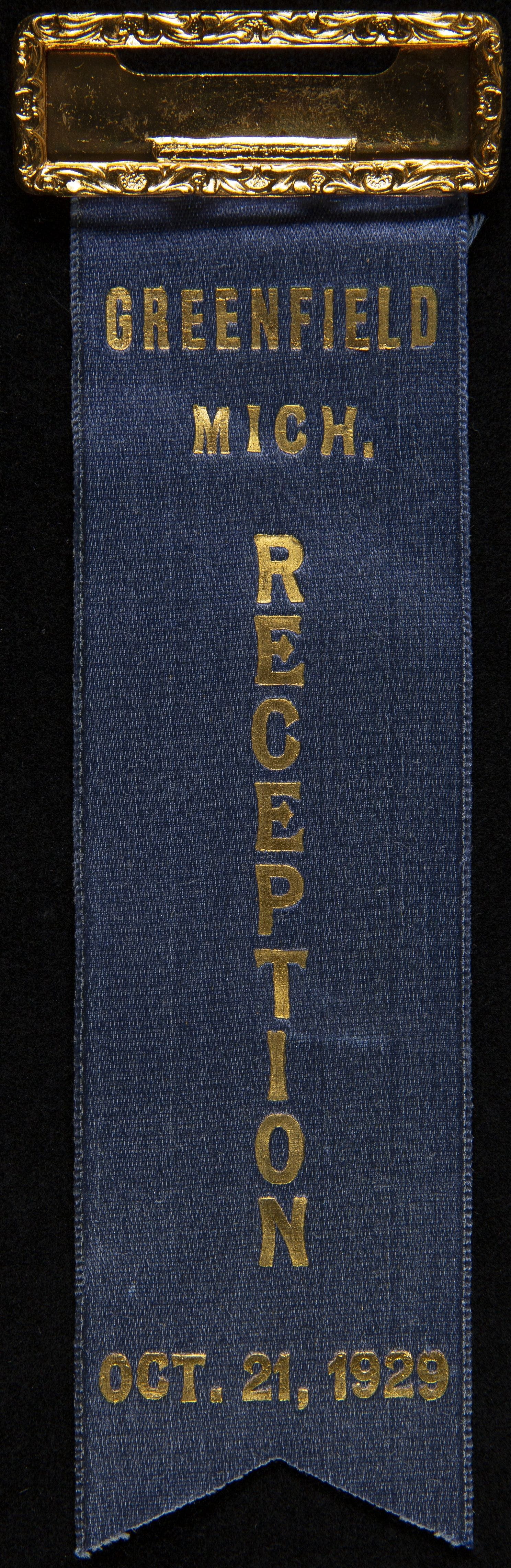printed on front: GREENFIELD / MICH. / RECEPTION / OCT. 21, 1929
