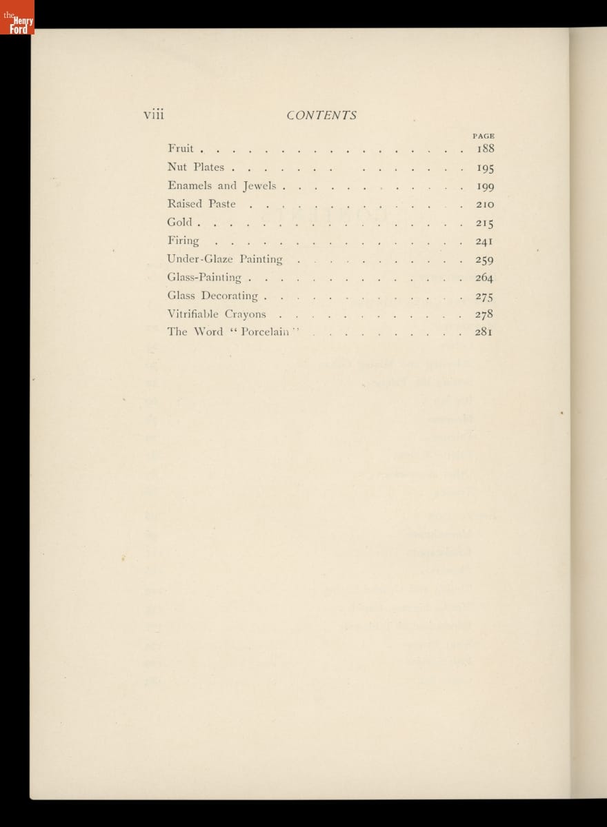 China painting was an important late-19th and early-20th-century pastime for many American women. They painted over the glaze of fired, undecorated pieces of white porcelain called "blanks." Amateur artists interested in china painting could purchase supplies--including blanks, paints, and instructional manuals such as this one--at specialty stores.