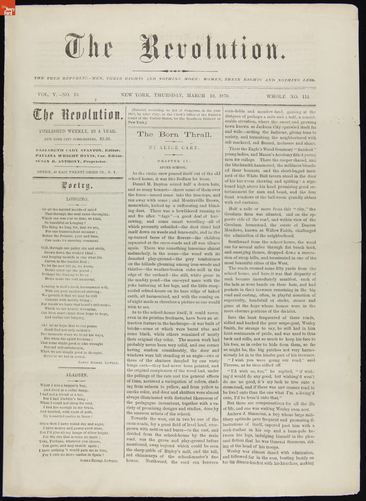 "The Revolution," a Newspaper Edited by Elizabeth Cady Stanton, Issue for March 10, 1870