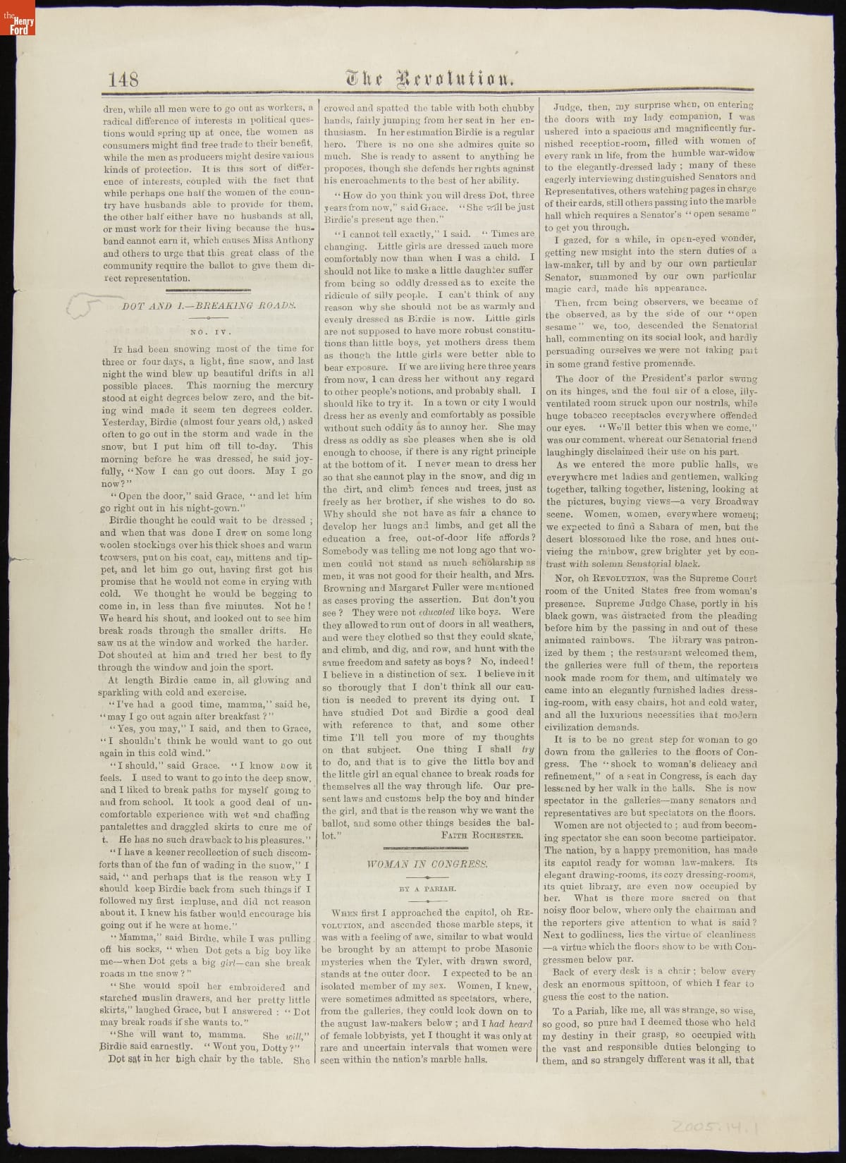 The National Woman Suffrage Association (NWSA) distributed The Revolution, a weekly publication. Edited by Elizabeth Cady Stanton, a pioneer in the early fight for women's rights and NWSA president, The Revolution featured essays supporting NWSA's agenda - namely suffrage, or equal voting rights - and reported on truly revolutionary advances toward equality in the workplace, at home, and under the law.