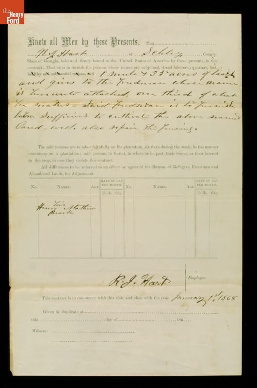 After the Civil War, white landowners contracted with black freedmen to work their land and grow crops. In this 1868 contract, R. Hart agreed to furnish Henry Mathew with 35 acres, a mule, and, after harvest, 1/3 of his crop in compensation for his labor. While seemingly straightforward many contracts trapped black laborers into a lifetime of poverty.