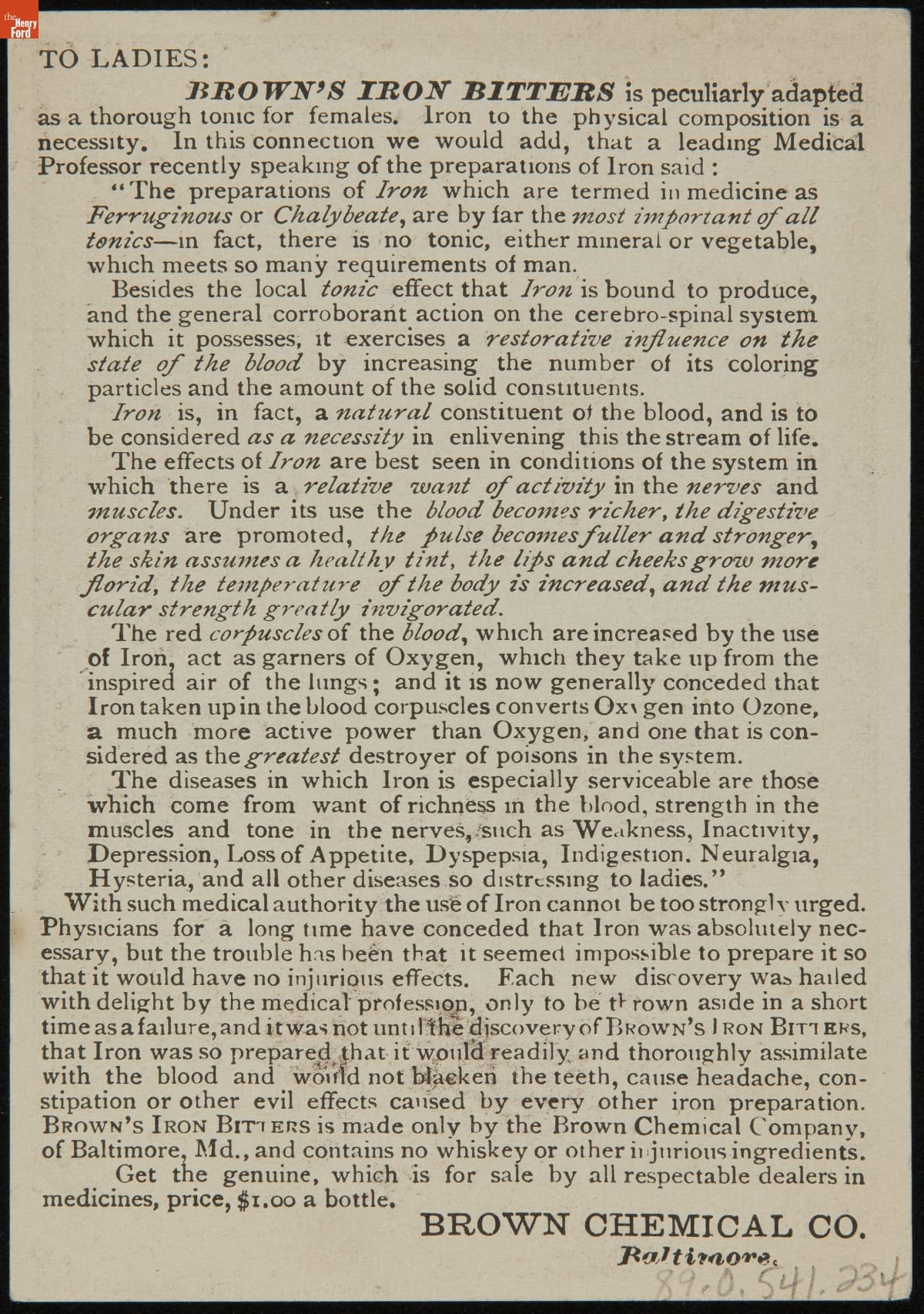 Trade Card for Brown's Iron Bitters, Brown Chemical Co., 1890-1900