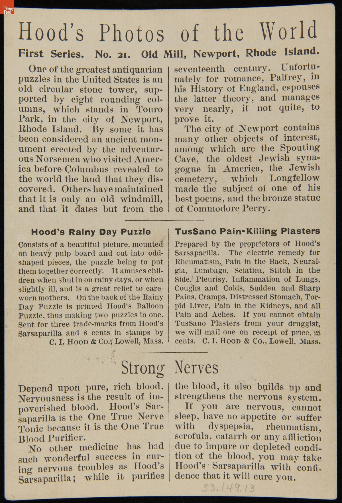 Trade Card for C.I. Hood & Co. with Hood's Photos of the World, "Old Mill, Newport, Rhode Island," 1890-1910
